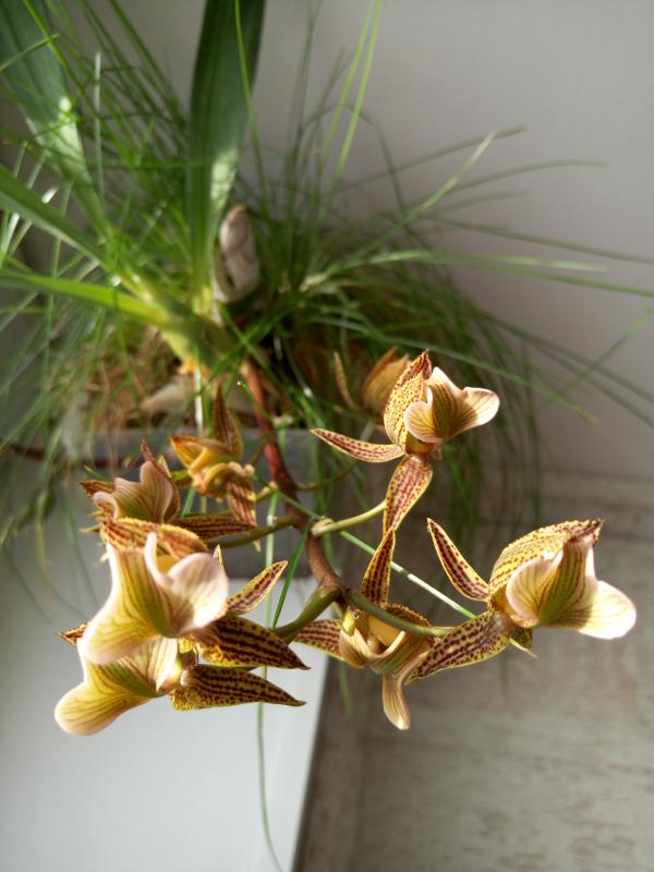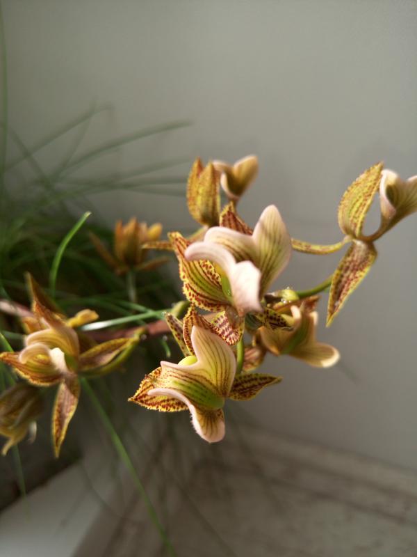Без отдыха, не переставая цветет Psychopsis Butterfly. Как только на одном цветоносе начинает отцветать цветок, на другом начинает раскрываться следующий.