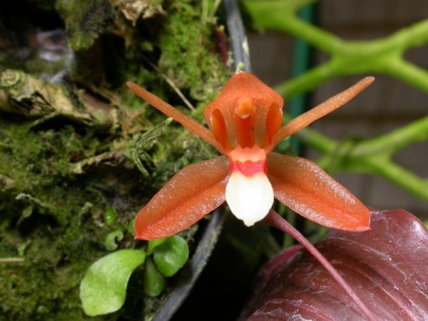 Гладкие, тупоугольные, постепенно сужающиеся к верхушке псевдобульбы, несущие одиночный, верхушечный, прямостоячий, медно-зеленый, продолговато-эллиптический, резко заостренный лист. Цветет прямостоячим затем поникающим цветоносом - 6.4 до 7" [16 до 17,5 см] длиной, Цветонос многоцветковый, возникающие на зрелых псевдобульбах.