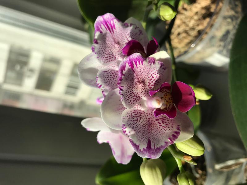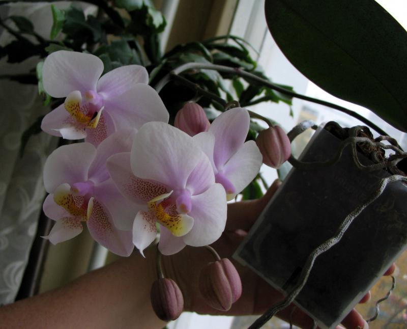 Итак, спустя 2 года от рождения мы зацвели. На сегодня временно пропавший у поставщиков фаленопсис Lioulin Moon OX1533 FCC/AOS.