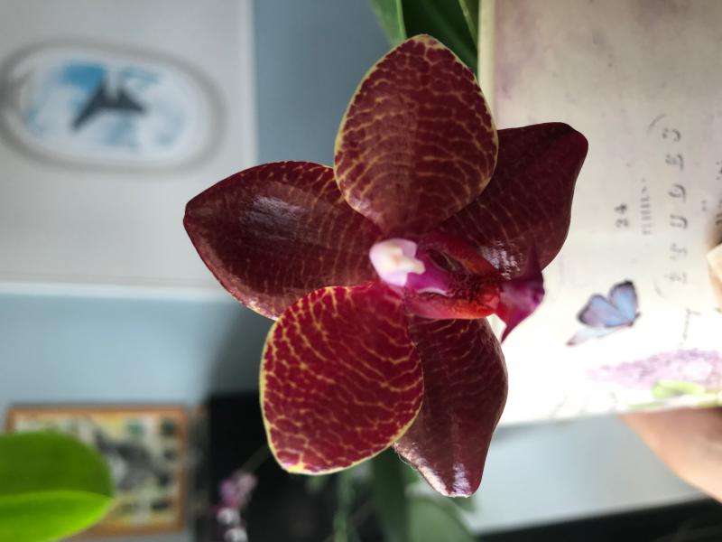 Первое цветение (вообще первое! у поставщика тоже не цвел) фаленопсиса Miki Brown Bear ‘1217’ цветок 7,5-8,0см. Здесь видна разница окраса при разном освещении