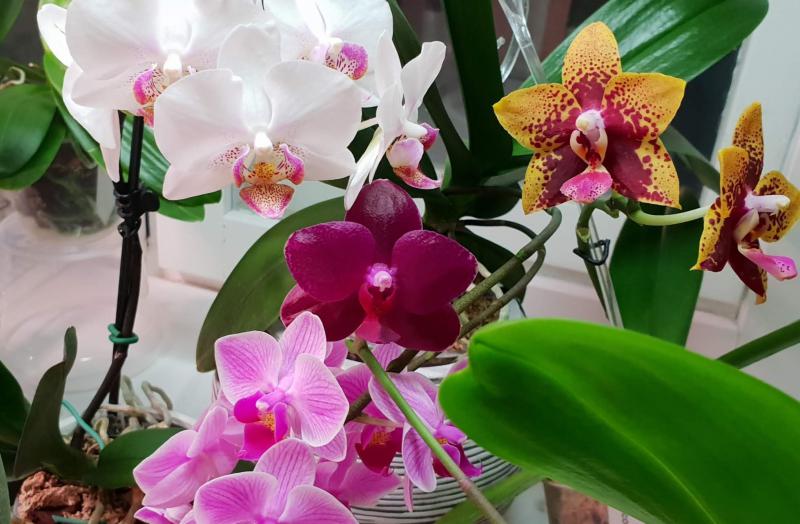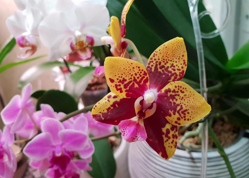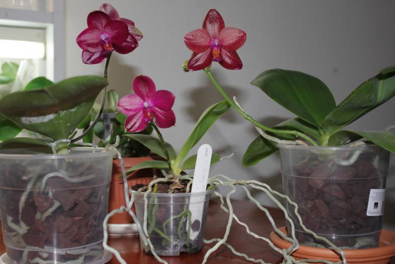 Phal. Mituo King April Blood (на общем фото слева), Phal. LD Sun Dragon Snake Scales (справа) и H456 Phal.Zheng Min Quetzalcoatlus (посередине).