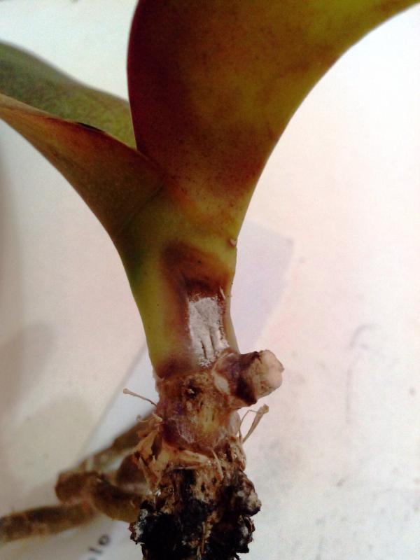 Энци, к сожалению, мой Singolo привез в себе скрытую бактериалку. Корни были сероватые , совершенно не реагировали на воду. Потихонечку я их срезала, обрабытвала янтаркой, чтоб новые начали расти. А потом как-то странно начал желтеть нижний лист, от центра к краям. Я решила его снять, а там пятно, которое уже проело насквозь всю розетку.
