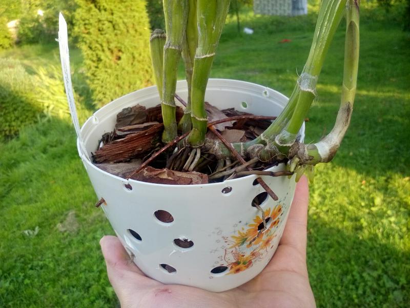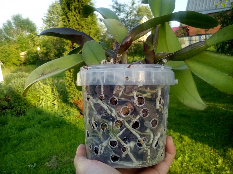 Ну вот... Мне казалось, что дырочки необязательно. Фракция крупная. Поливаю нечасто. Опрыскиваю каждый день. Думал, что корни вполне себе дышать там могут + влажность для листьев... Особенно если учесть, что из питомников взрослые растения приходят вообще в каких попало условиях, при этом цветут и растут...