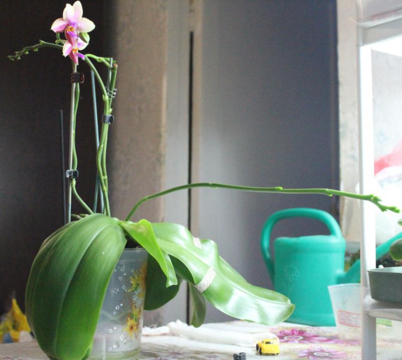 Эта Лиодора сейчас ветвит 2 старых цветоноса и гонит новый (всего 4 цветоноса получается), на одном уже 2 цветочка распустилось. Параллельно растит листья непрерывно (25 см каждый, пол-метра в размахе). В-общем, лошадь.