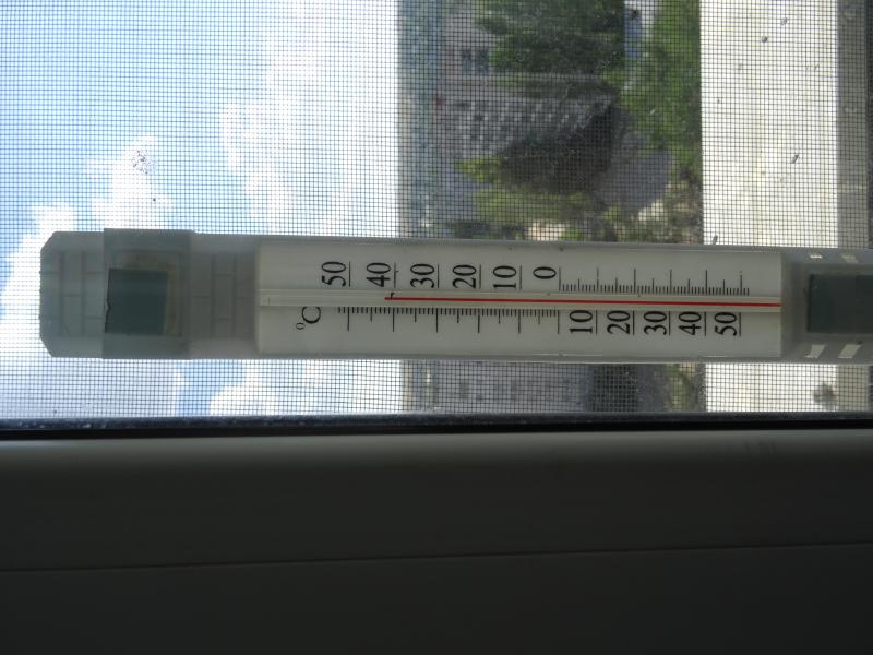Вторая фотка, чтоб видно было, что градусник точно в тени находится и поверхность, на которой он закреплен, тоже. Более того, у нас дома прохладнее, чем на улице. А градусник на открытом немного вовнутрь окне. Так что, на улице еще жарче.