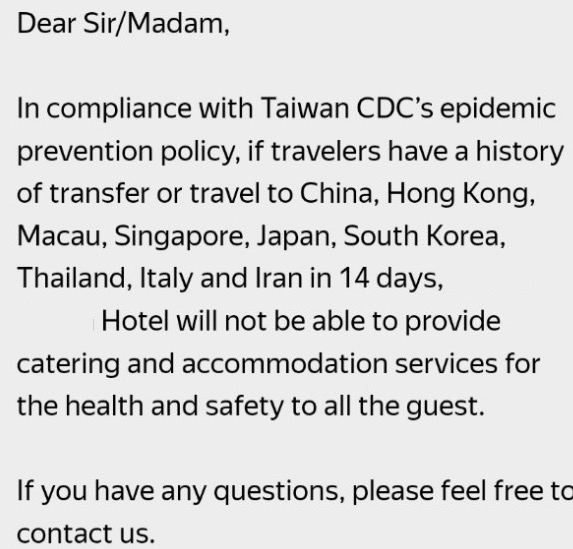 Местные власти в дополнение к уже озвученным ограничениям приняли решение о том, что все иностранцы, прибывающие на Тайвань из Южной Кореи (с 25 февраля) и Италии (с 28 февраля), будут обязаны пройти двухнедельный домашний карантин.