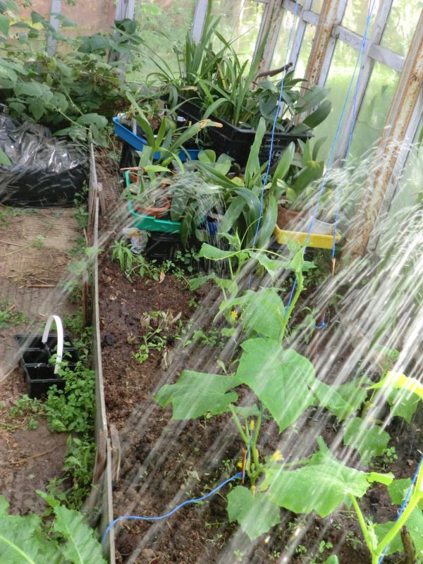Знаете, на лето некоторые орхидеи я вывожу на дачу. Ставлю в теплицу. Так как сама на даче бываю не очень часто, то полив огрурцов и орхидей доверен местному таджику. Поливает сверху из шланга или лейки.