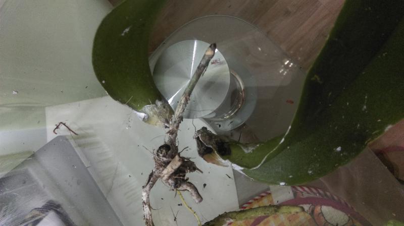 Все корни сухие, 2 старых цветоноса, шейка подгнила. Фактически корней нет, всего два листа, но здоровые и чистые.