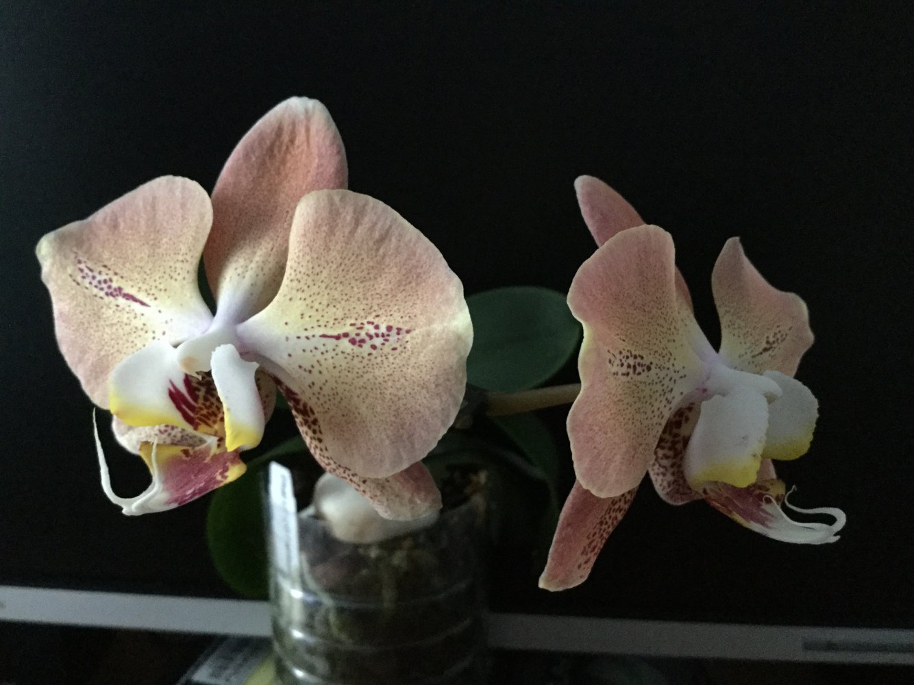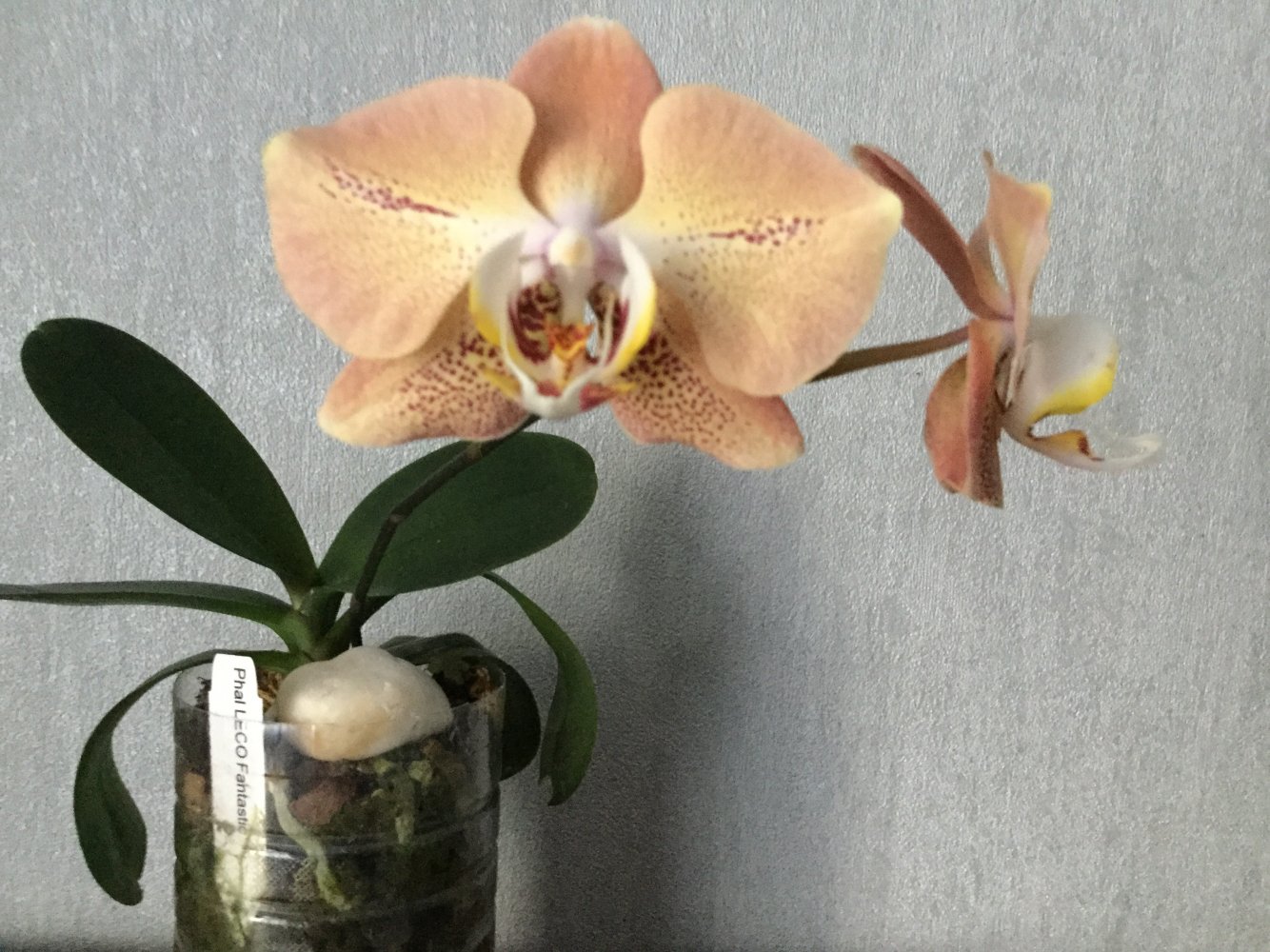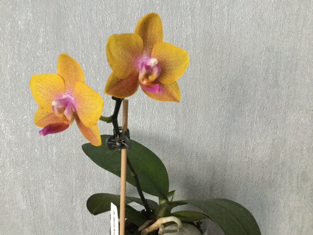 P. Gold Aroma Sara (ex32960), получен год назад, первое цветение, цветонос около 10 см, два цветочка размером чуть больше 5 см, пахнет специями, с горчинкой.