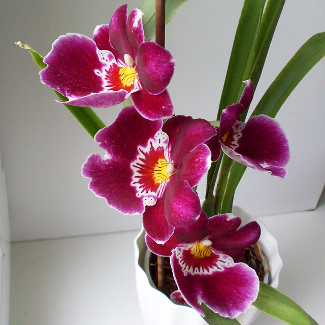 Не оставляя попыток обзавестись капризной мильтонией и похожей на неё мильтониопсис, в феврале прошлого года приобрел новую красавицу. Ввиду предыдущего печального опыта была применена принципиально новая схема ухода. Спустя год появился цветонос, а два месяца назад Miltoniopsis Red Tide полностью расцвела, я очень обрадовался! Крупные цветки, бархатистые лепестки, большая губа с волнистым краем и белой каймой, уникальный рисунок, отдаленно напоминающий анютины глазки из детства, и сильный тропический аромат – всё в ней прекрасно!