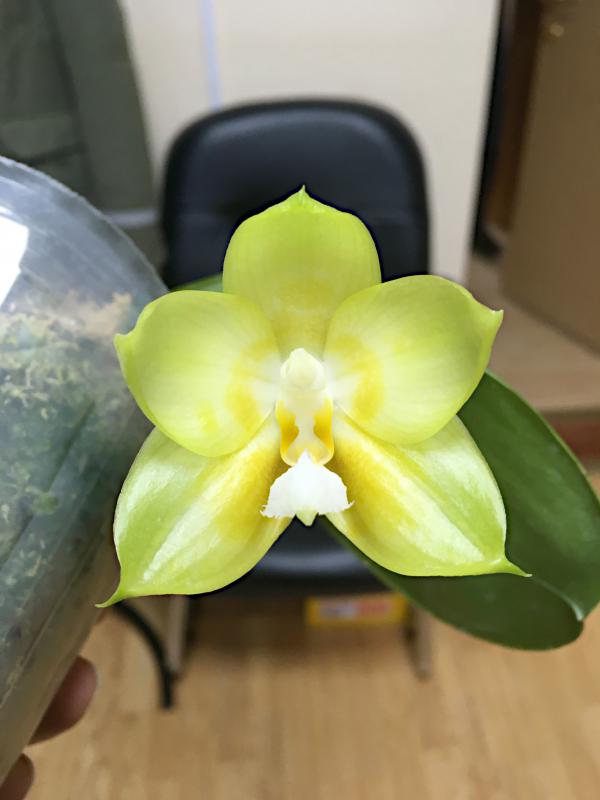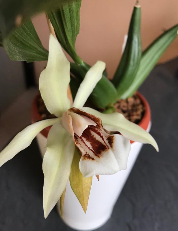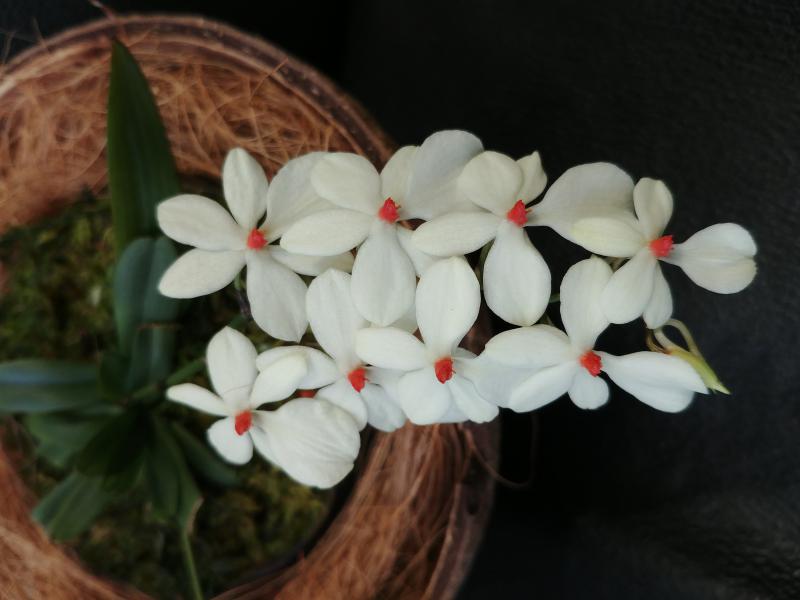 Aerangis luteoalba var rhodosticta Размах розетки листьев 7,5 см, размер цветка 3х2,5 с шпорцем, без запаха, цвет кремово-белый, как на общем фото. Получен из Ecuagenera в сентябре 201920200219_102216_HDR.jpg20200219_102347.jpg