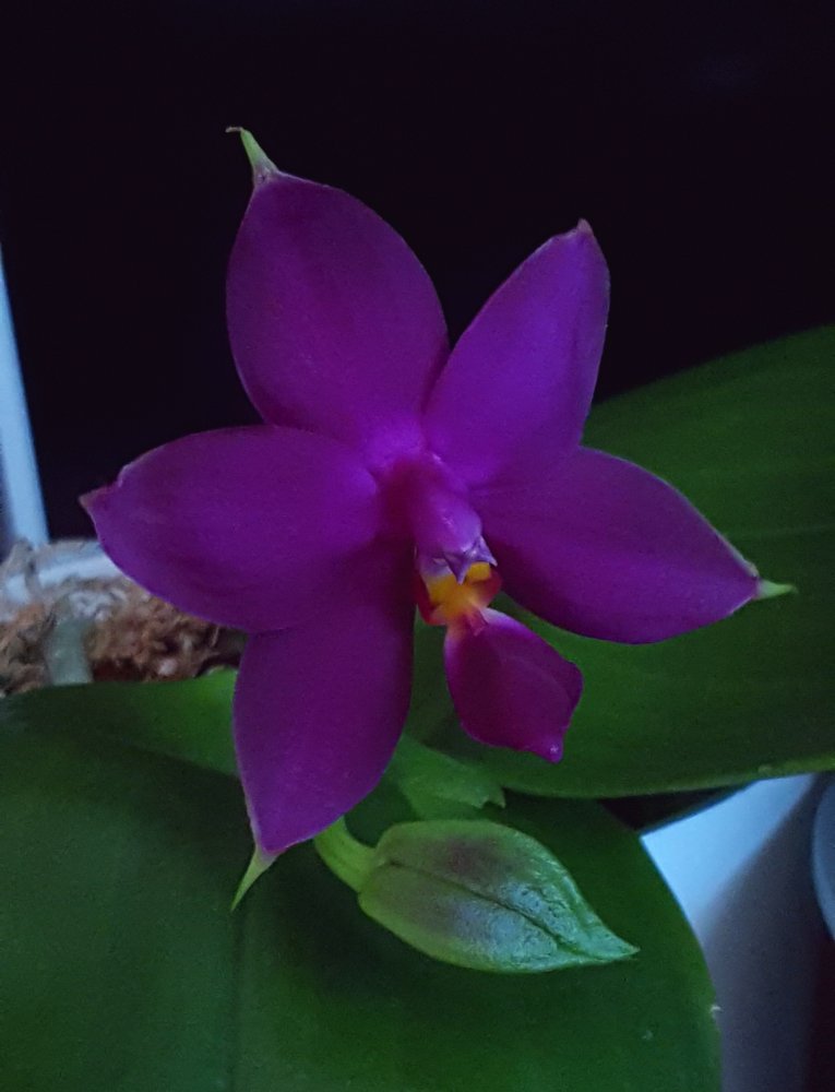 Теперь могу уже полностью описать цветение P.Samera ‘blue’ x Purple Martin. Ожидала цветок побольше, так как очень похож на самеру, но 4,2 см. по петалиям, а по сепалиям, вернее защипам на них, по диагонали, аж до 5,5 см. дотянул. Цветонос 3й, поэтому скорее всего так уже и будет. Запах с нотками корицы, не сильный, если нос в цветок прям сунуть. Цвет насыщенный, трудно передать на фото. Листья красивые, блестящие, розетка пока небольшая, 12см. лист. Он же рядом с Гваделупой пинедой, для сравнения.