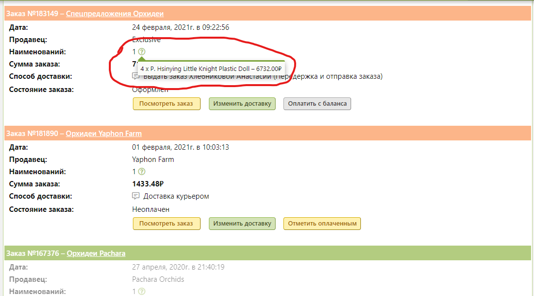 Действия с заказами кроме статуса "доставлен", то есть выполненными?Жаль убрали сортировку по последним действиям, очень удобная была. Когда происходят действия с заказами сделанными 2-3 года назад как теперь это искать? Неужели кто-то помнит номера заказов, артикул заказанного растения или точное его название в каталоге![]()