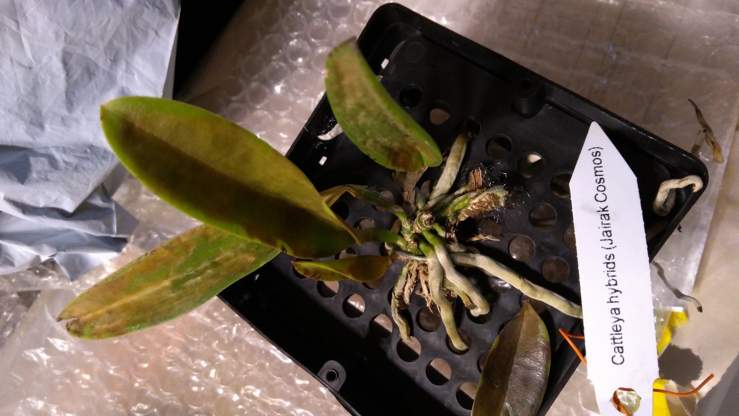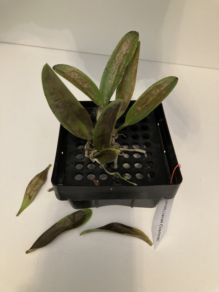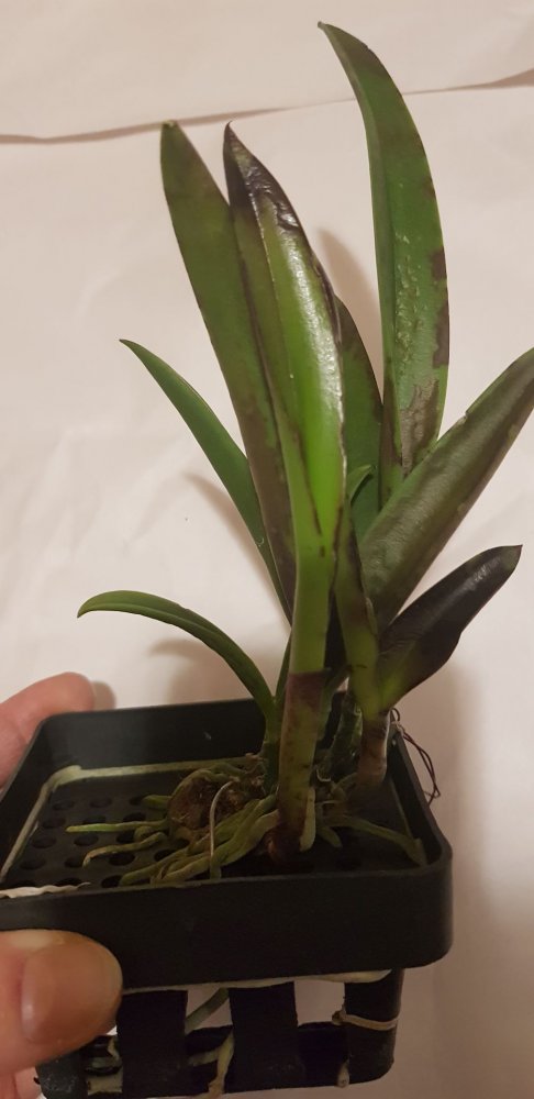 Что с катлеями пока не понятно, я полила дистилятом свои, корни из бело- серебристых стали зелеными, ризома зелёная, бульбы маленькие тоже зеленые, а листья в пятнах.