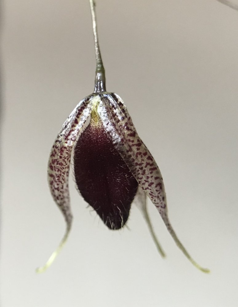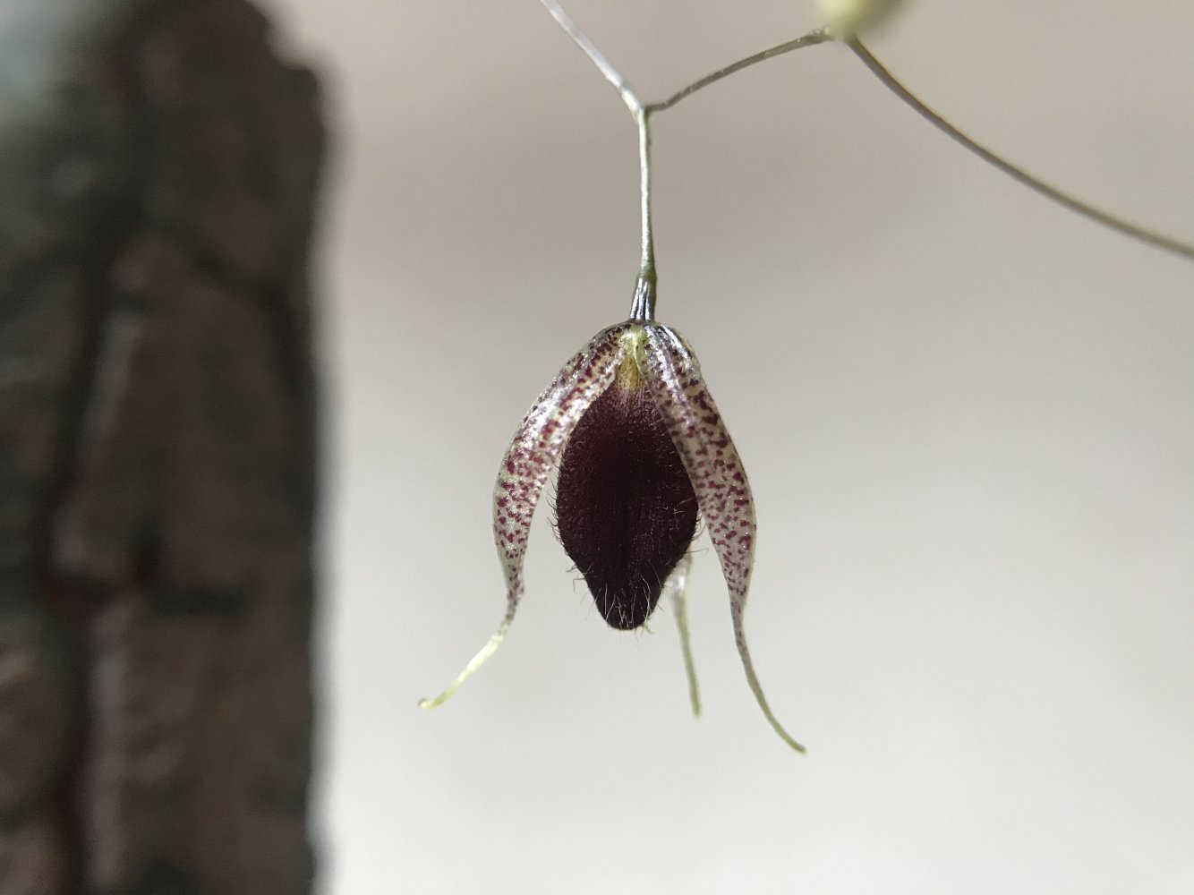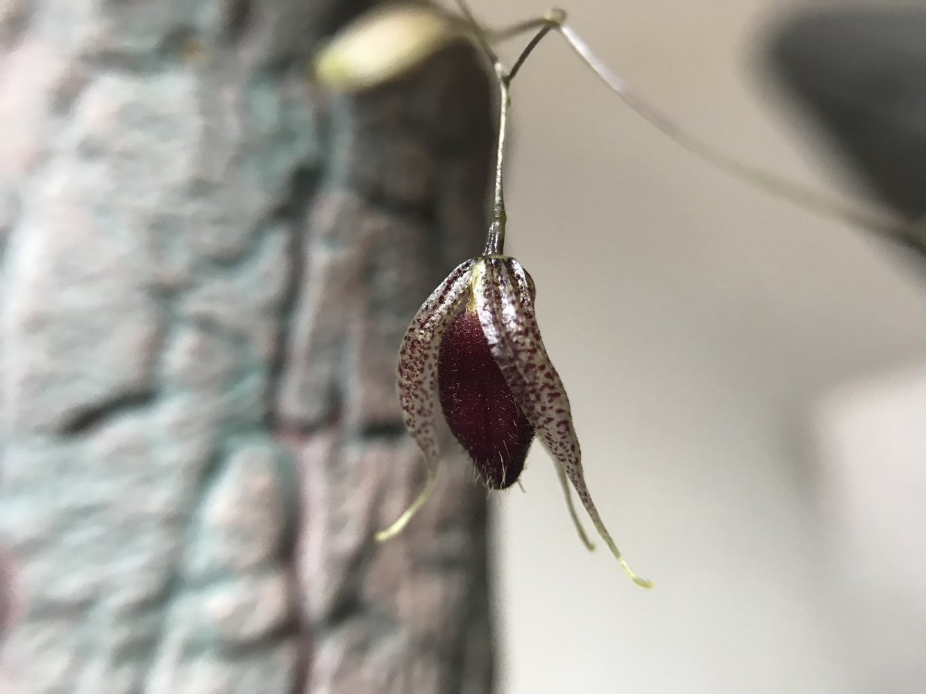 У меня впервые расцвёл Pleurothallis megalops. Получила его летом, немного побросался листьями, потом ощетинился цветоносами, потом засушил их, подразнил бутоном и не распустился, и вот наконец-то. Крупный довольно таки цветок для этой группы, 2 см точно есть.