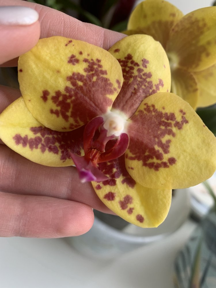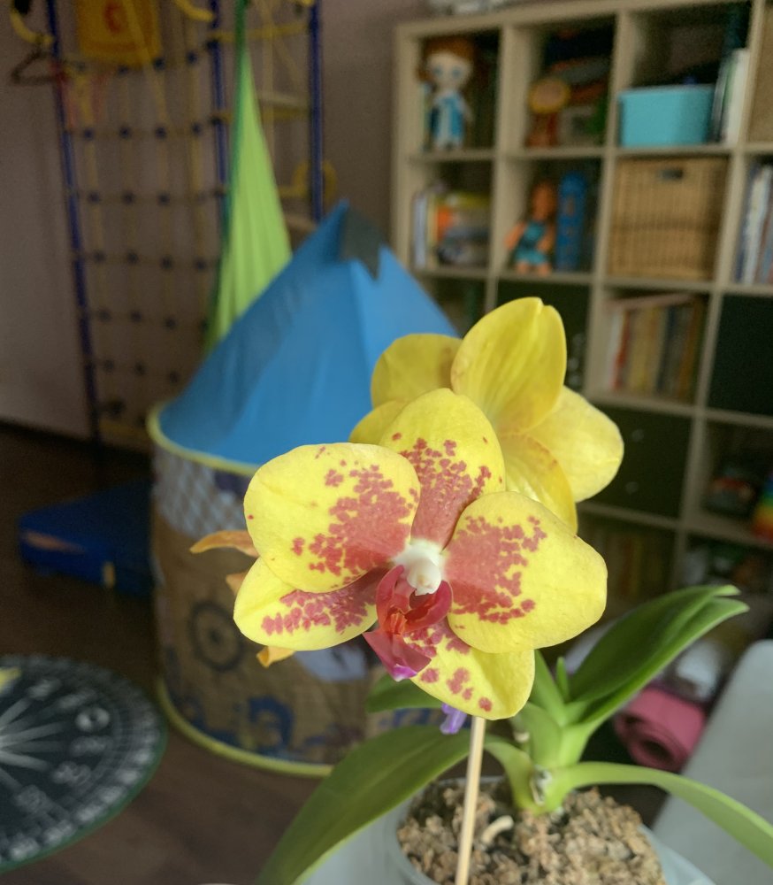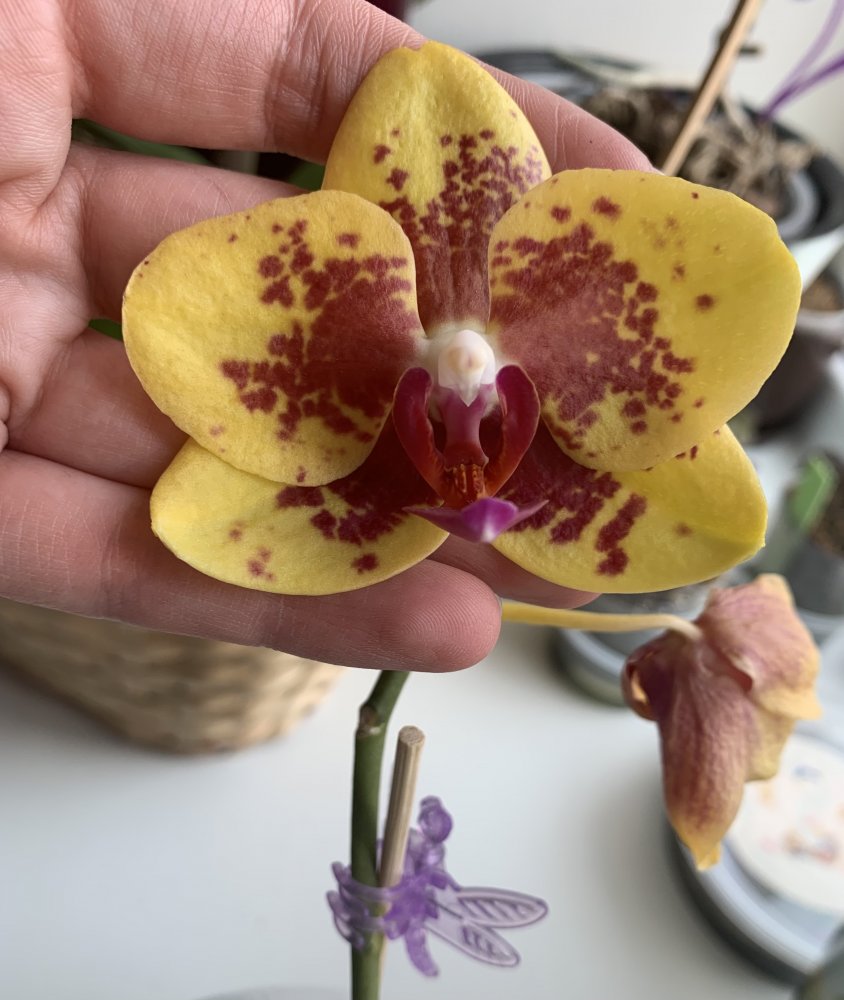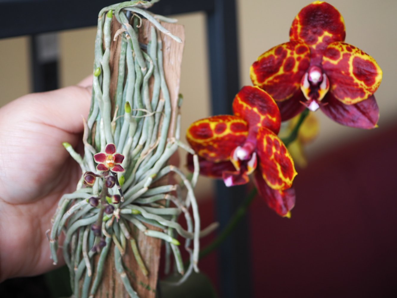 Нижний цветок фаленопсиса, с нескрываемым удивлением и любопытством,посматривает на миниатюру шилошистыЕдинство цвета и контраст размера.