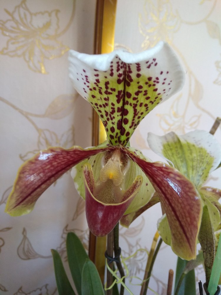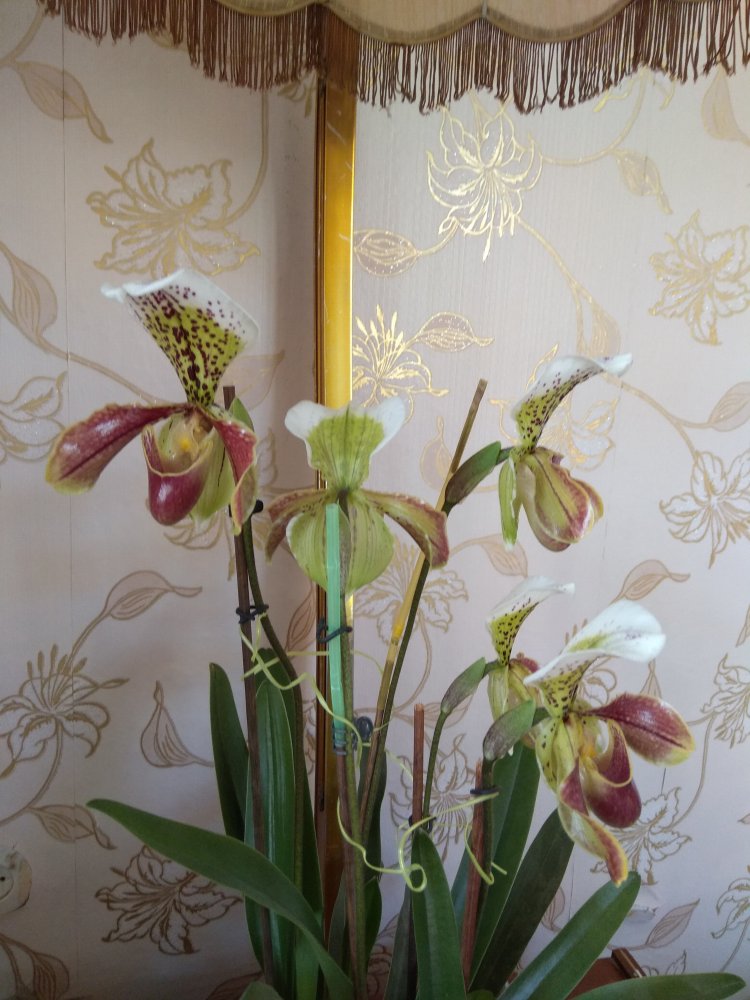 В марте полностью распустился первый пафиопедилюм. А сегодня уже 1 мая, а ВСЕ ПЯТЕРО стоят, как солдатики! Очень хороший цветун!!! Скорее всего это - Американец, получен от Карге с биркой Rosy Dawn. Я довольна!!! Цветки чуть- чуть отличаются- не смогла выбрать самый красивый!