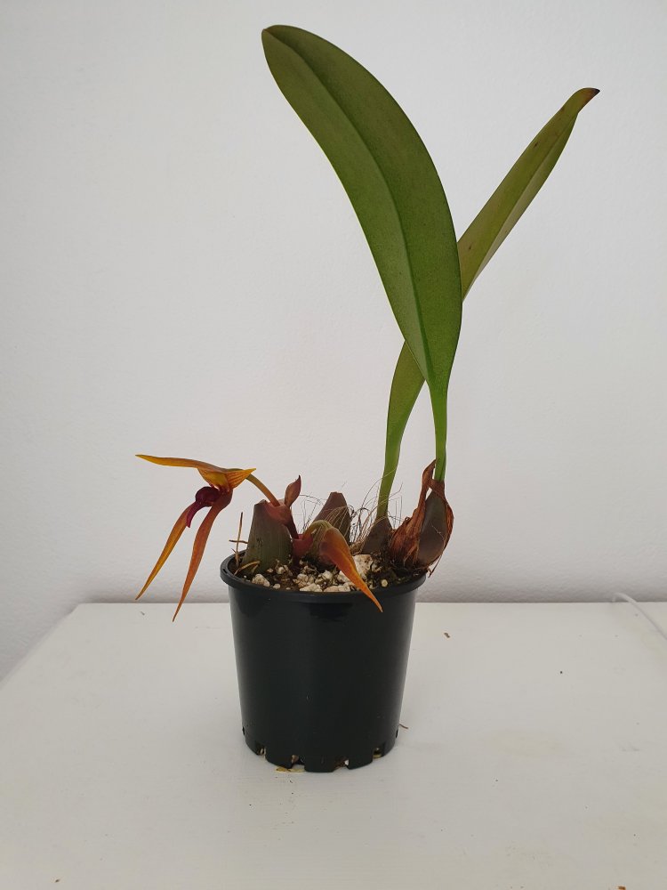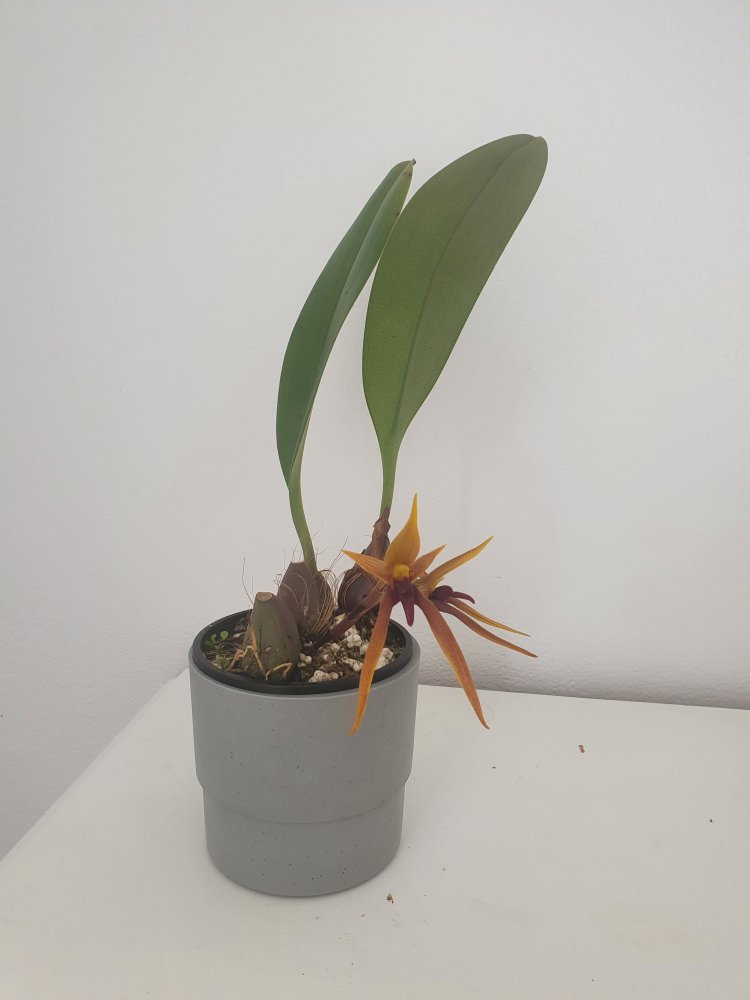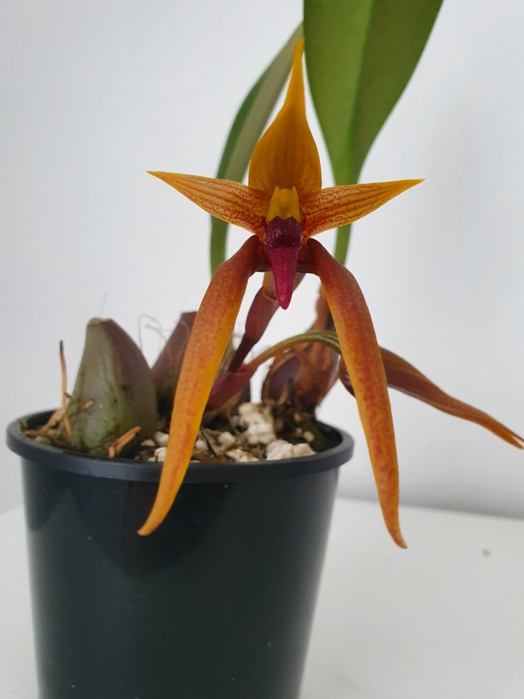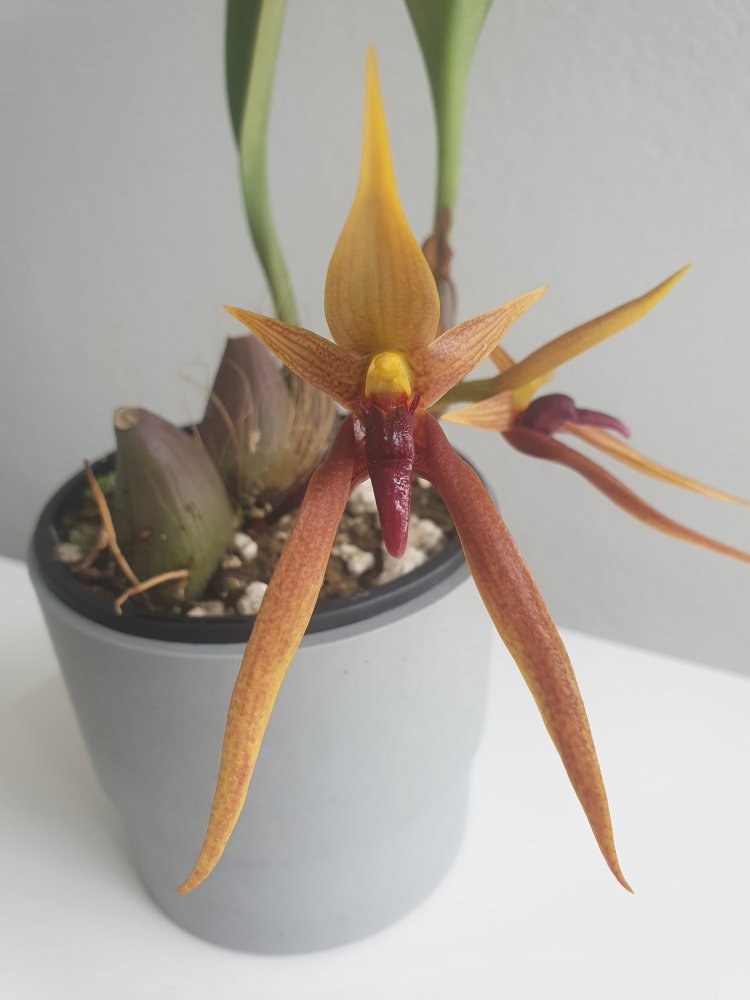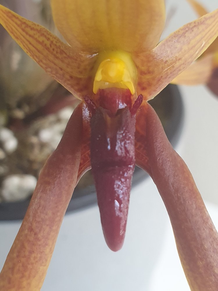 Уточнение: это оказался пересорт. Правильное название этого чуда Bulbophyllum trigonosepalum, и он из группы nymphopolitanum. Филиппинский эндемик. Полностью раскрытый цветок в размере 10 см, губа подвижная, сепалии толстые мясистые.У меня новая радость, Bulbophyllum orthoglossum зацвел, плюс раскрывает второй бутон и продолжает растить стрелку вверх. Воняет какашками, но не сильно, только если нос прямо в него засунуть. Это скорее как развлечение, а так запах никому не мешает, в отличие от dendrochilum irigenze который вонял на весь дом горелыми покрышками и машинным масломЦветок у этого экземпляра получился крупный, больше 8 см.