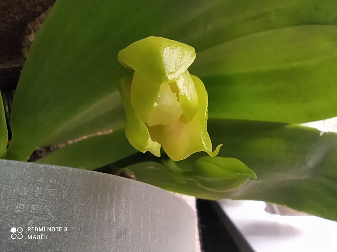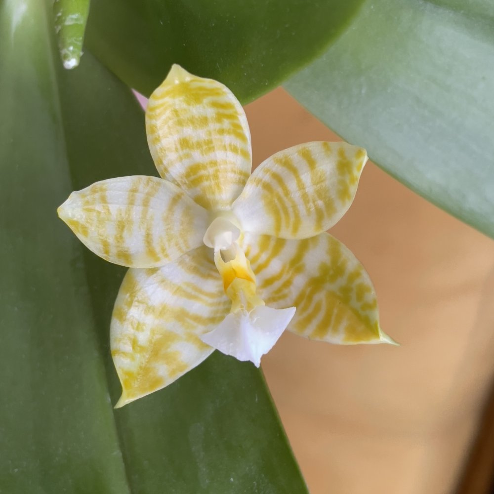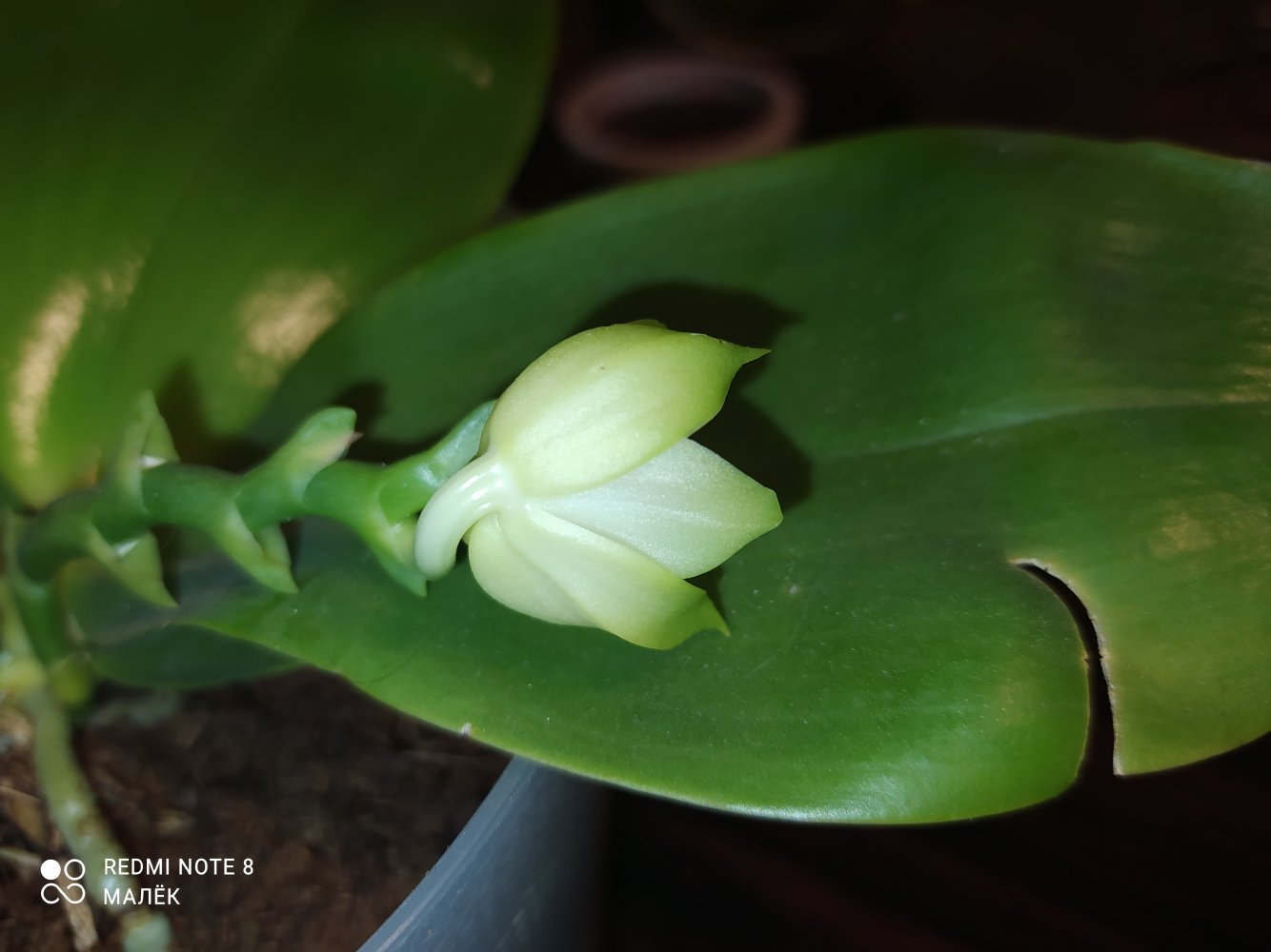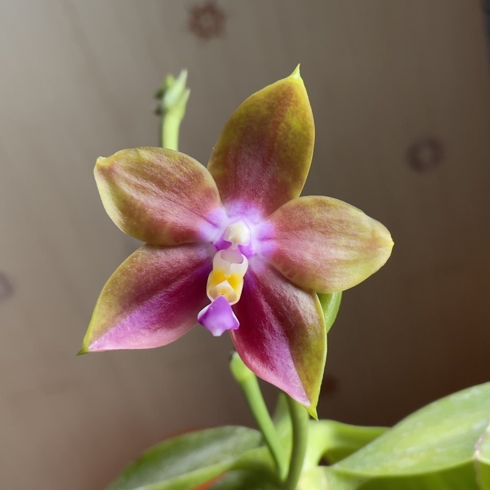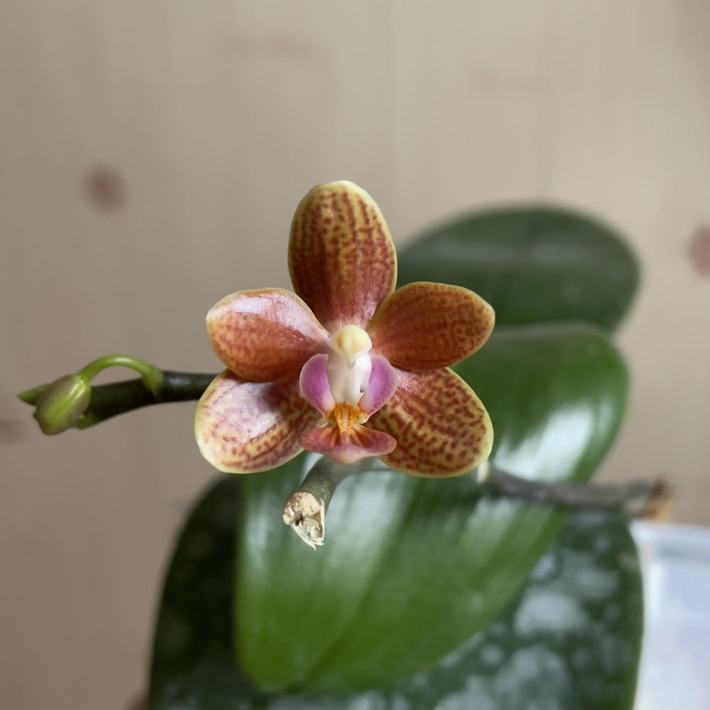 2.Phal. silberqure x hanhenensis. Тоже первый бутончик распустился, маленький, глянцевый, должен быть многоцветковым: