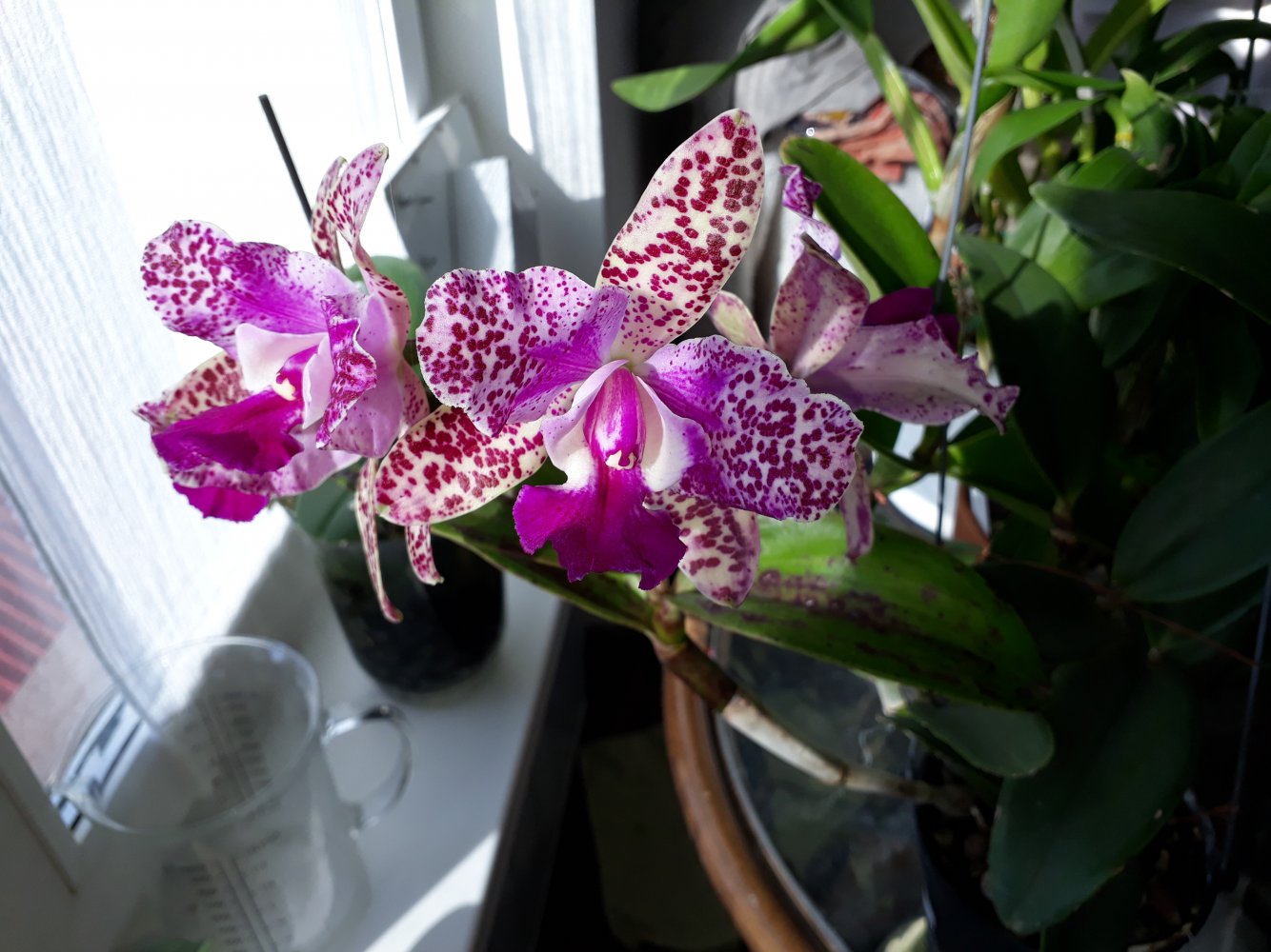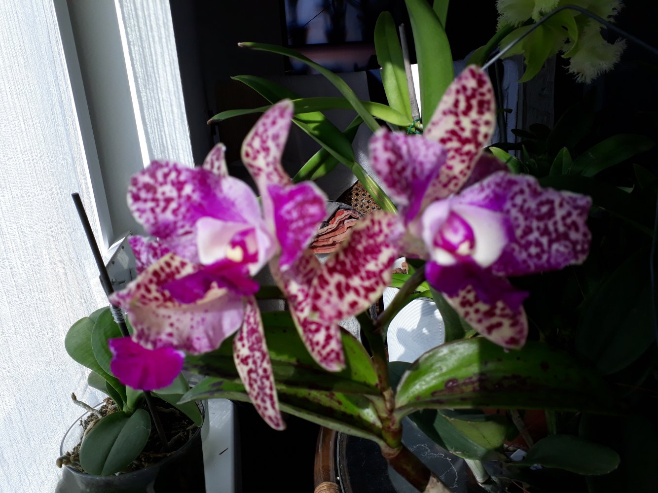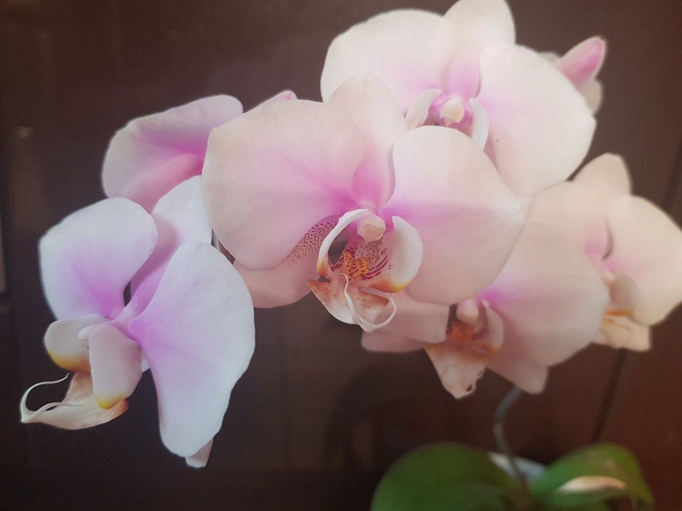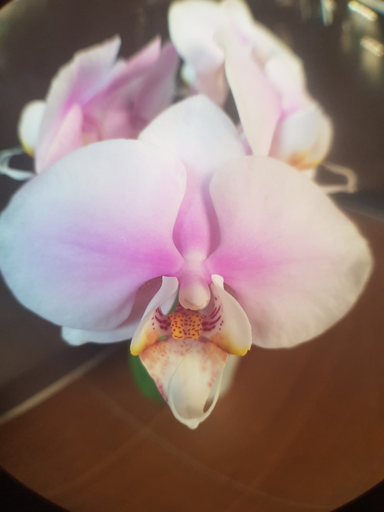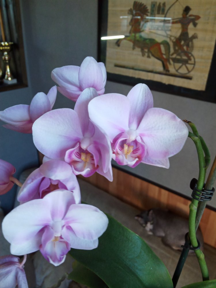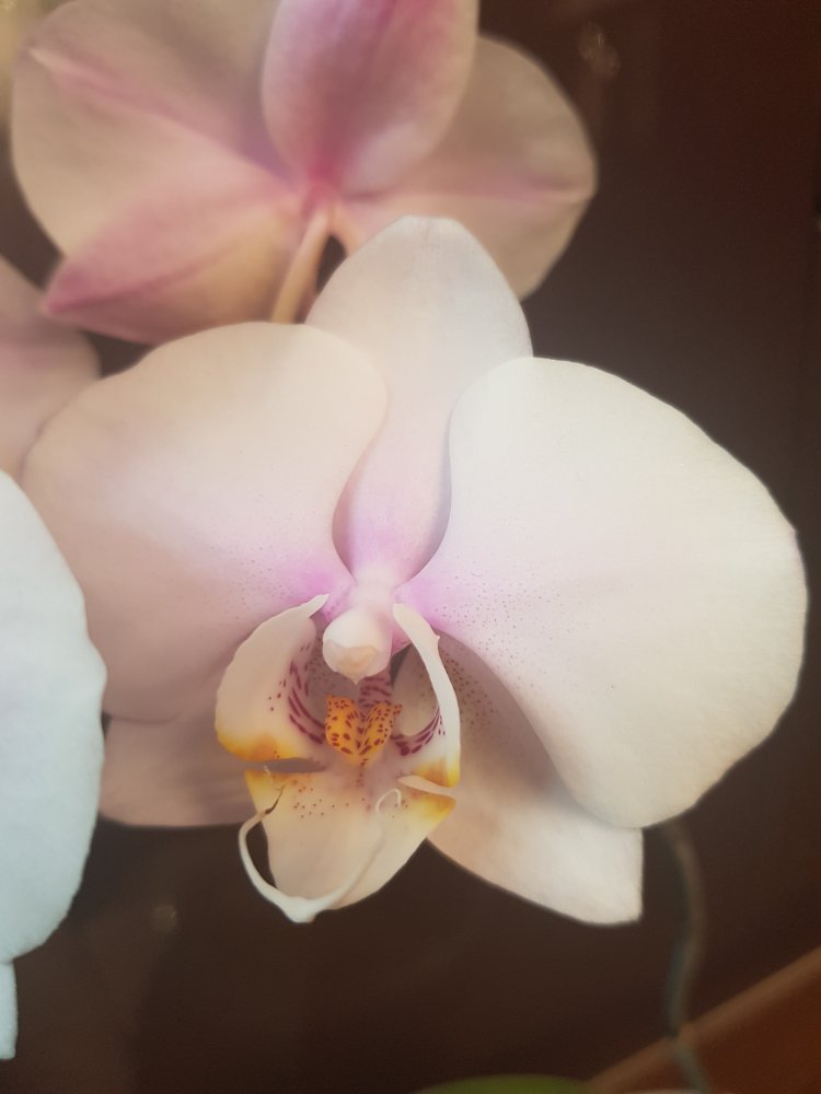 Спец. Получен в мае 2021г., цветет аналогично вашему и на ожидаемое не похож.Единственное что заметила, когда начал распускаться была жара и розового мало, а последний цветочек уже в холод распустился и у него больше розовых разводов. Но губа как была так и осталась белой, цвет не приобрела.