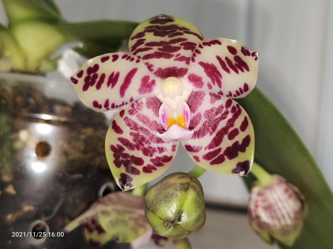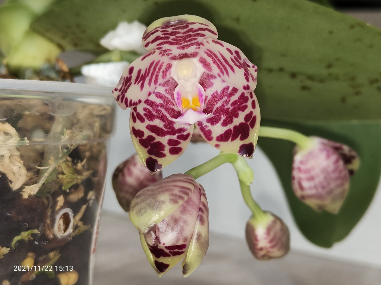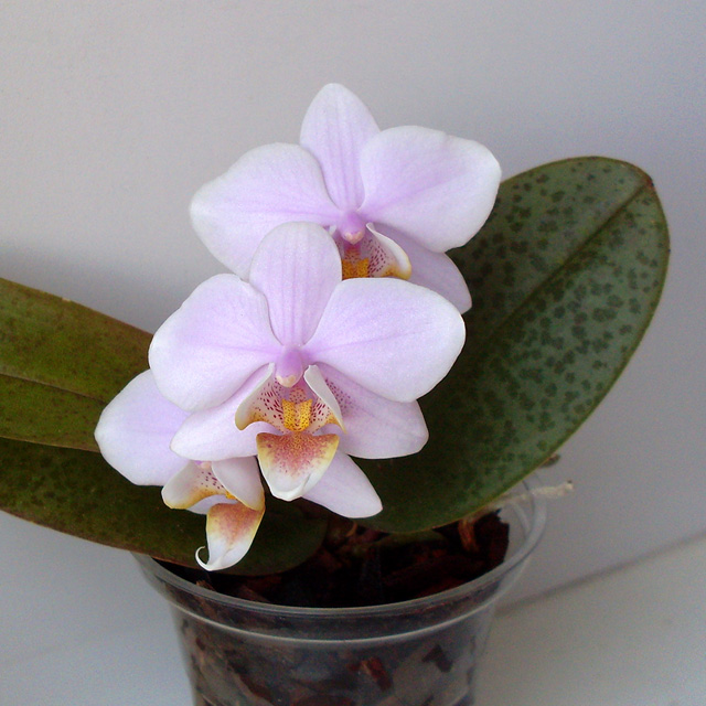 Первый раз цвела маленькая Phalaenopsis Palm Coast, выросшая на цветоносе материнского растения и год назад посаженная отдельно. Детка не уступила ни по длительности цветения, ни по интенсивности аромата, ни по размеру цветков, ну разве что по их количеству. Прелестное дитя с веснушчатыми листиками.