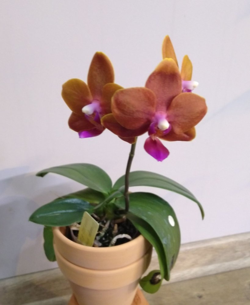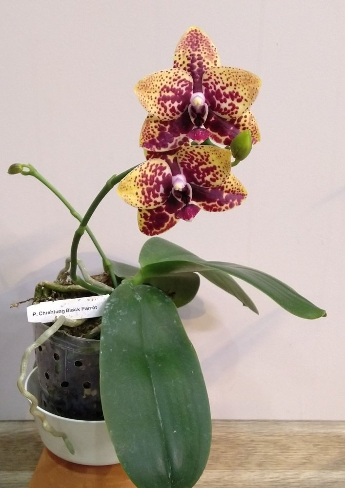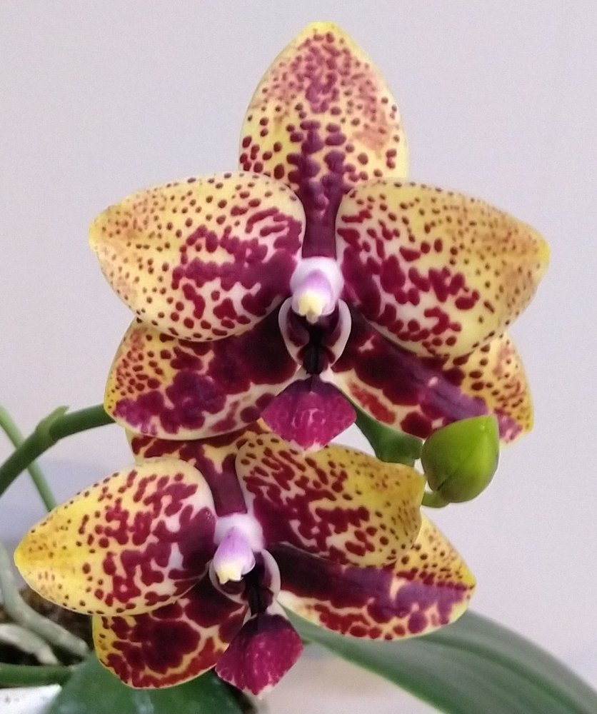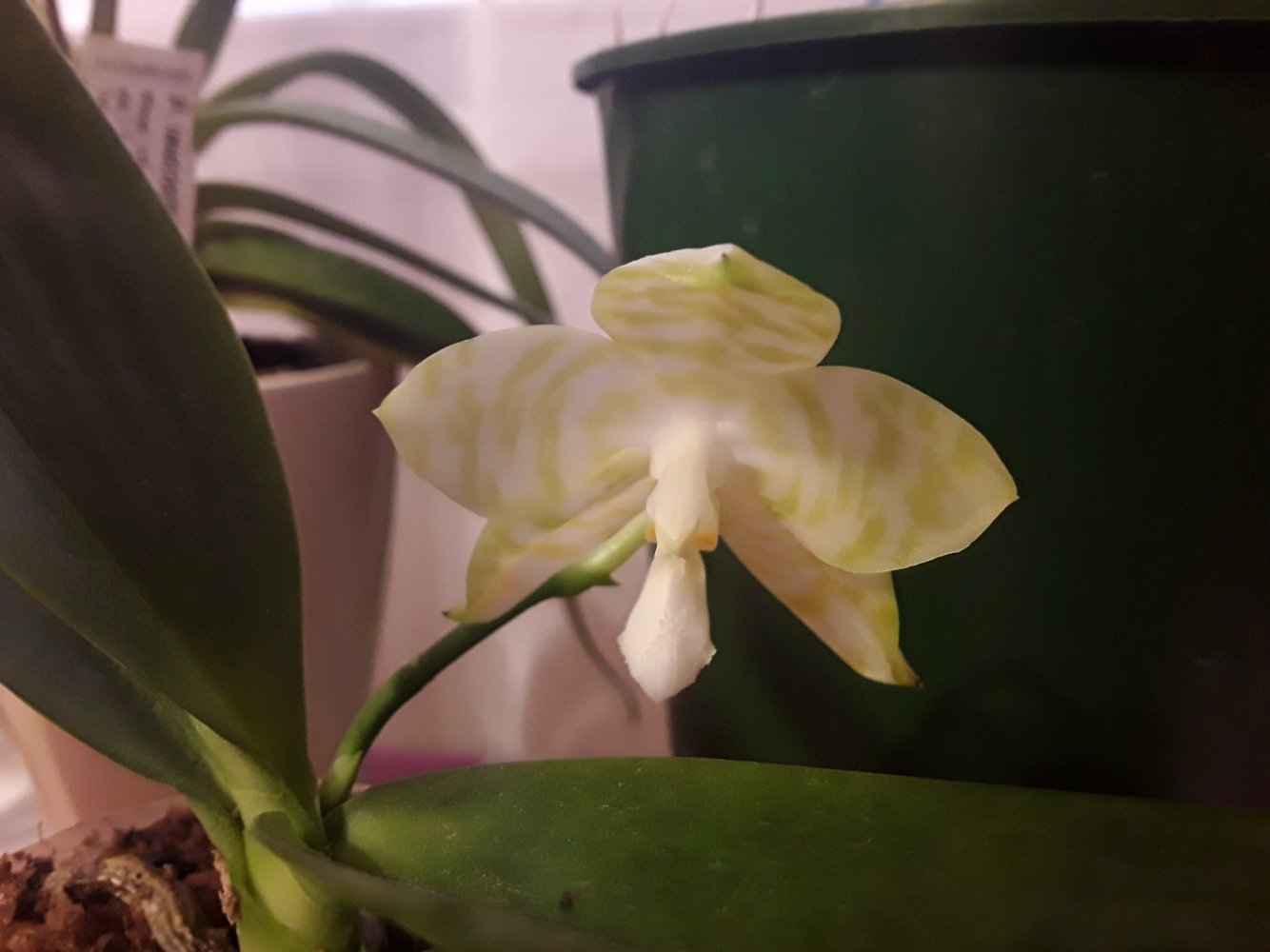 P. Mituo Golden Tiger "White Tiger", получен из спеца меньше двух лет назад очень не крупным молодым растением. В горшке тогда был еще один, но совсем крошечный, он сразу погиб. Было вложено 2 одинаковых бирки, видимо с расчетом на второе растение (у кого получены такие же - это не прикорневая детка, это отдельное растение из одной фласки, просто не стали отделять их друг от друга). Адаптировался с переменным успехом- то отлично рос, то начинал загнивать. Листики у этого фаленопсиса тонкие и слегка волнистые. Зацвел первый раз, для меня это стало сюрпризом, поскольку растение еще очень молодое и маленькое по размеру. Очень довольна, именно то, как я себе его и представляла)).