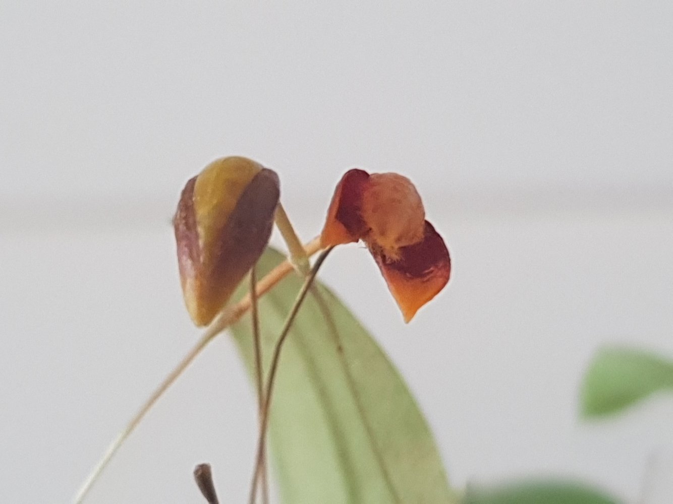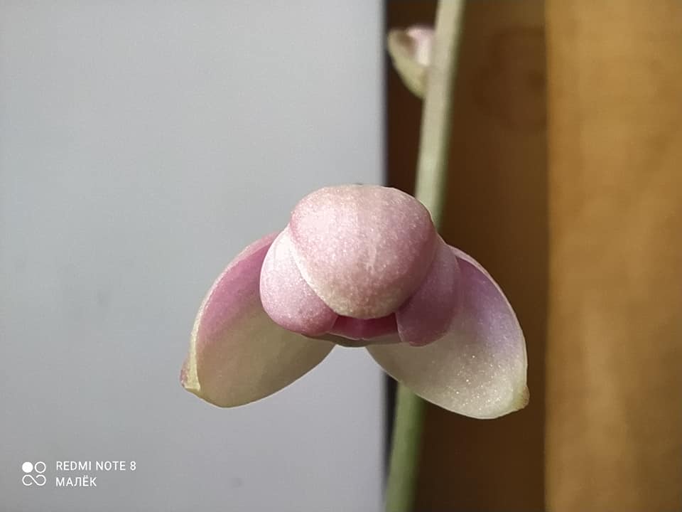 Цветение дневное, каждую ночь и в пасмурную погоду цветки закрываются. Держатся недолго, несколько дней, неделю максимум, но их много и они сменяют друг друга. Запах отсутствует. Основание латеральных сепалий фиолетово-пурпурное, но камера этого почему-то не хочет передавать. Капюшон (дорсальный сепалий) всегда опущен вниз, прикрывая крошечную губу с петалиями. Цветёт преимущественно со старых псевдобульб.