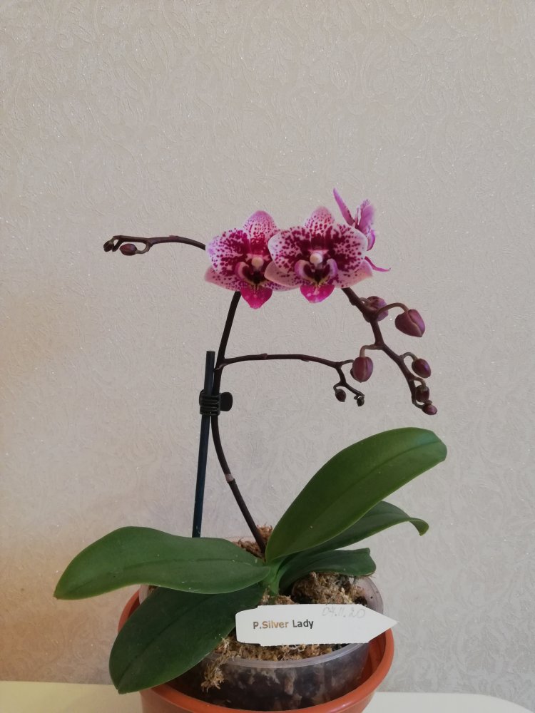 Расцвел спец 40020 Silver Lady. Фото продавца для сравнения. Цветы некрупные 4 см, аромата нет, цветонос красного цвета. Предполагаю, что со временем будет обильно цвести.