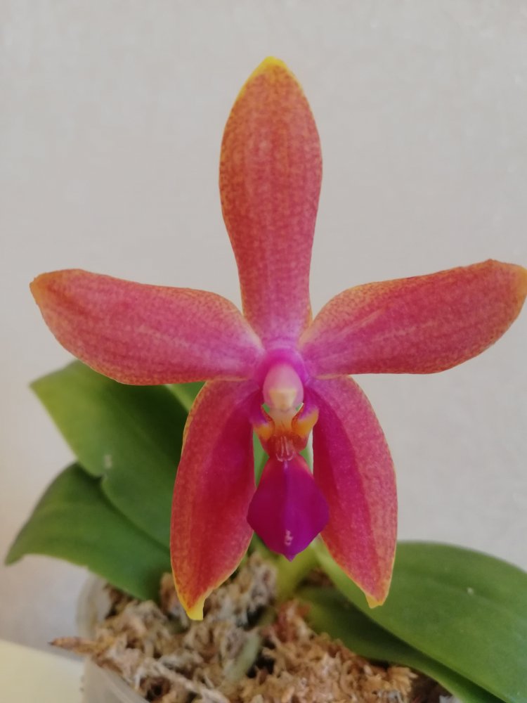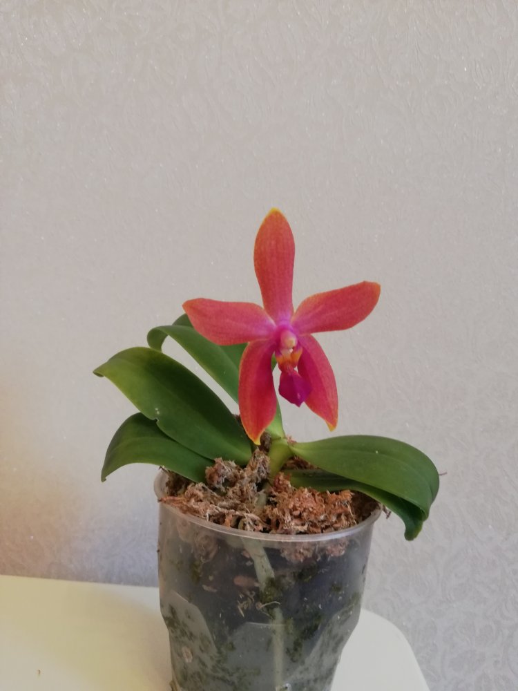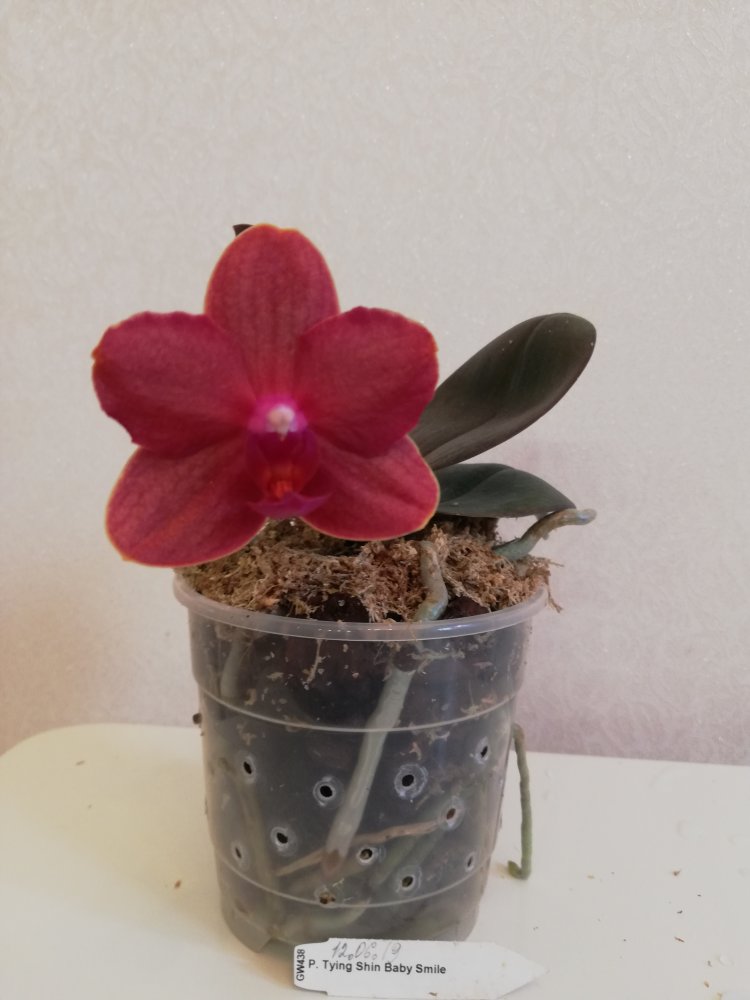 Tying Shin Baby Smile. Получен в июне 2019.Первое цветение. Размер цветка 5.5 см. Фактура плотная, лёгкое гофре на лепестках присутствует. Цвет теино-красный. Есть лёгкий аромат, если носом уткнуться, не цветочный.