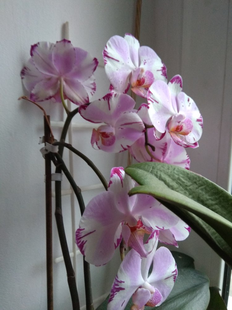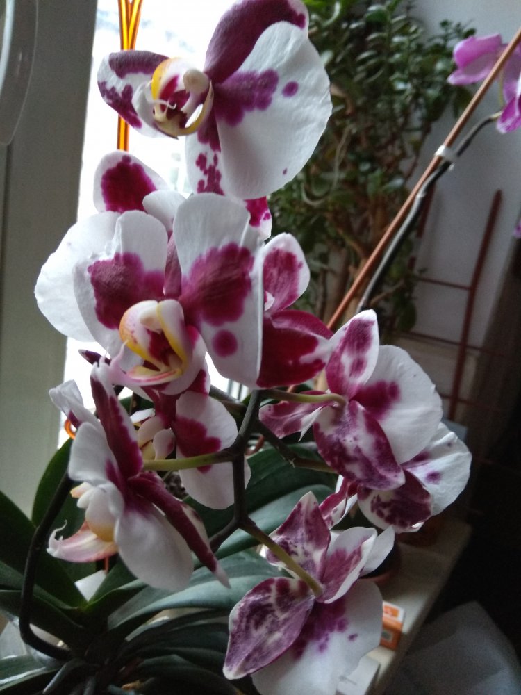 Цветут P. Polka Dot`s и DTPS. Jiuhbao Angel(?). Может, это и не Ангел, но он все равно хорошо,- цветение больше 6 месяцев, цветок 7 см! Со временем расцветка бледнеет.