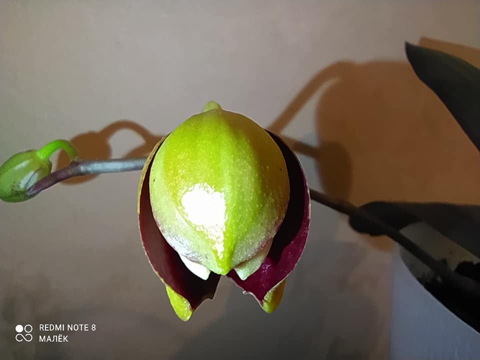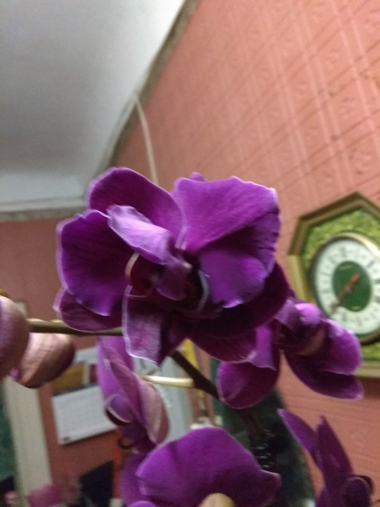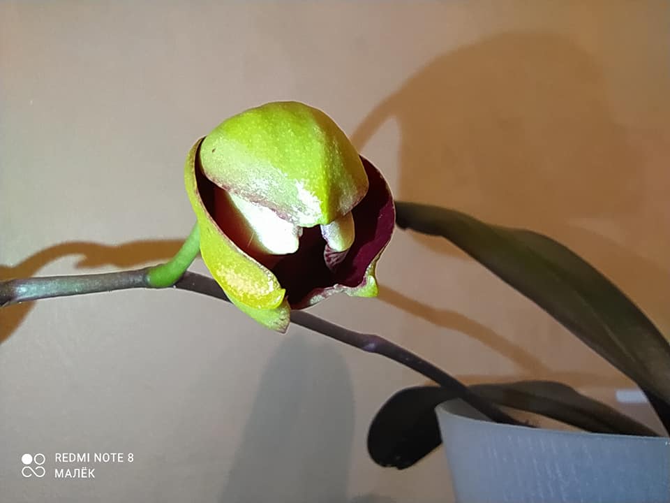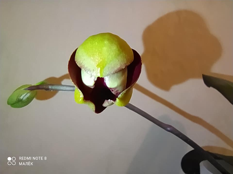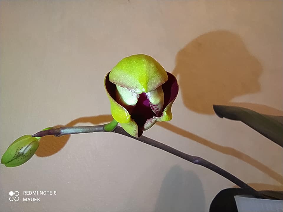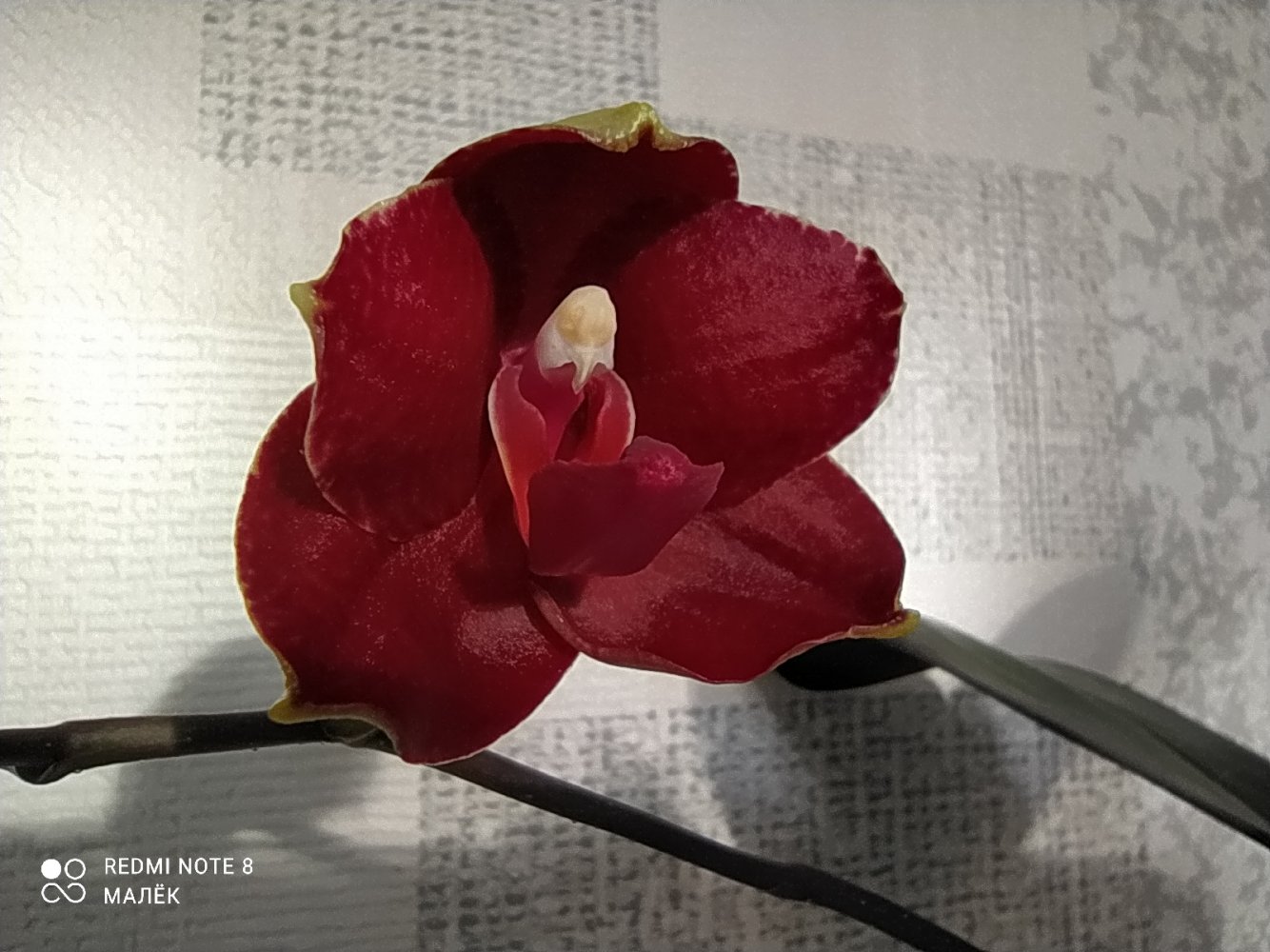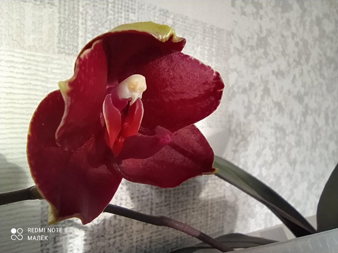 Бархатная Роза,- при покупке цветок напоминал розу, все лепестки были в двойном количестве, за исключением "губы" (фото 1), впоследствии форма цветков стала стандартной. Цветок крупный- 8-9 см, с белой каемкой по краю, цветонос больше 1м длиной, разветвляется, листья длинее 40 см!
