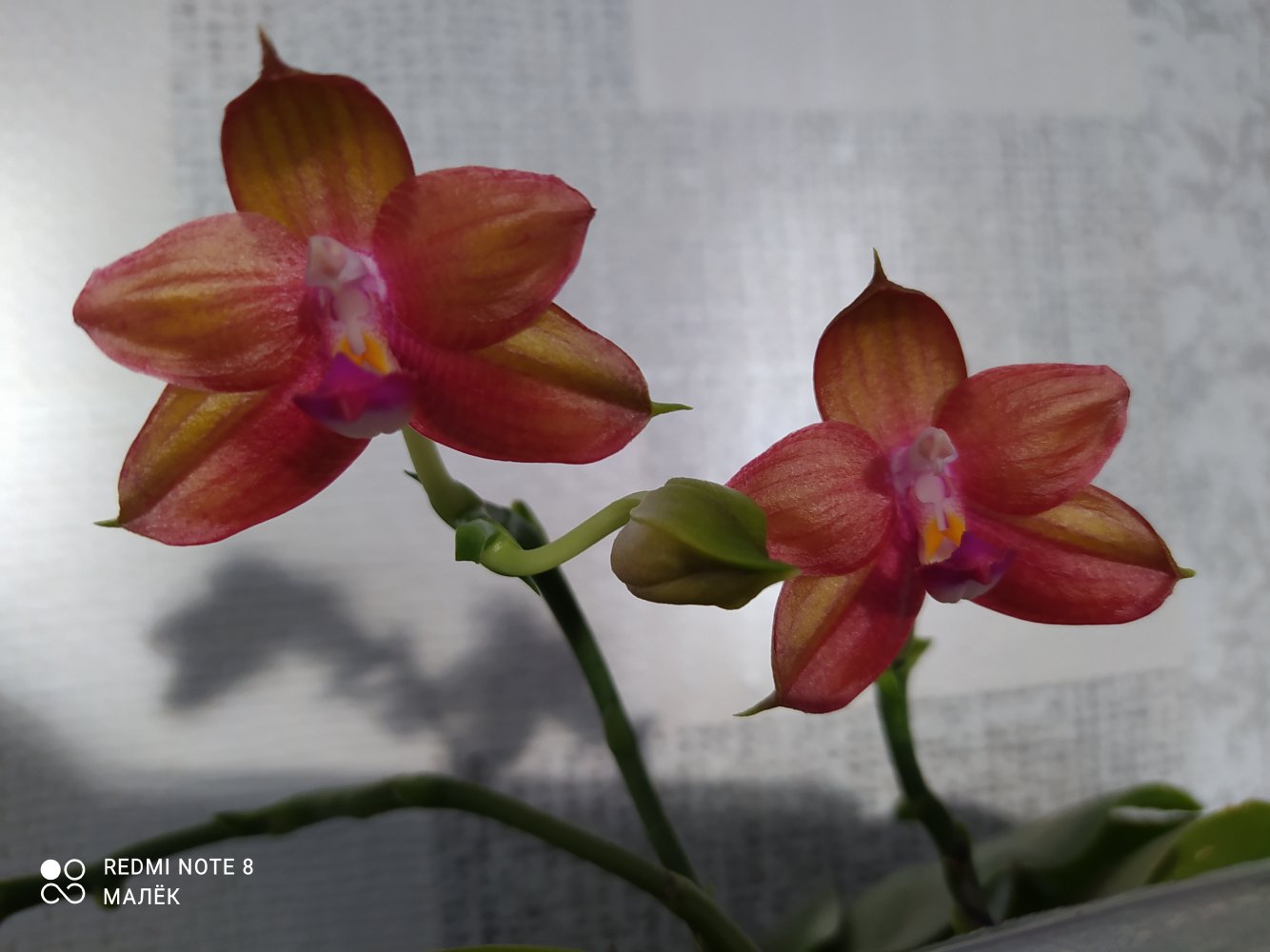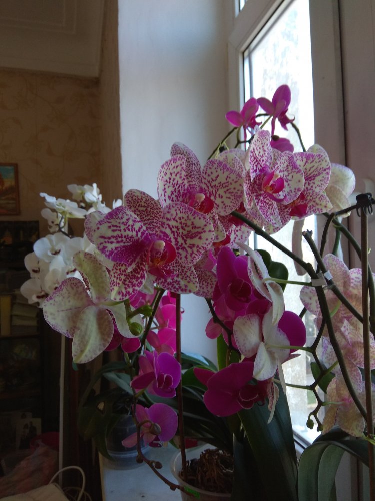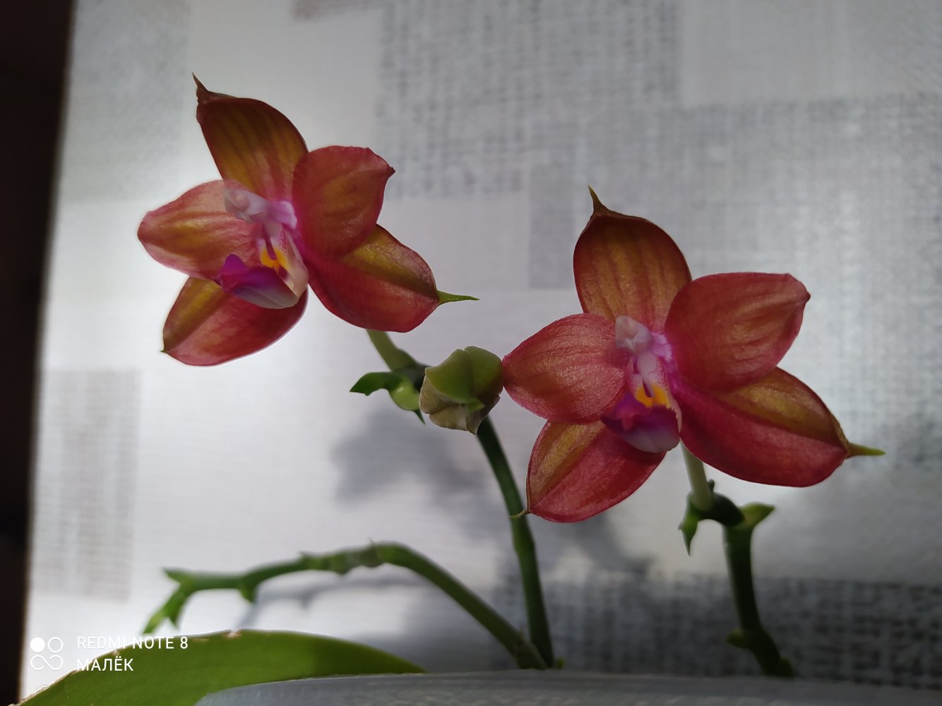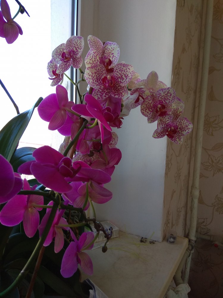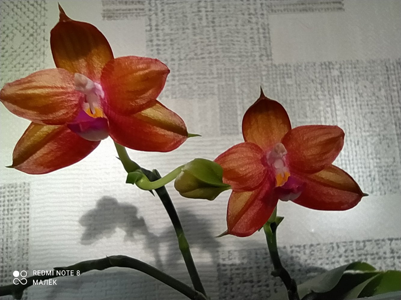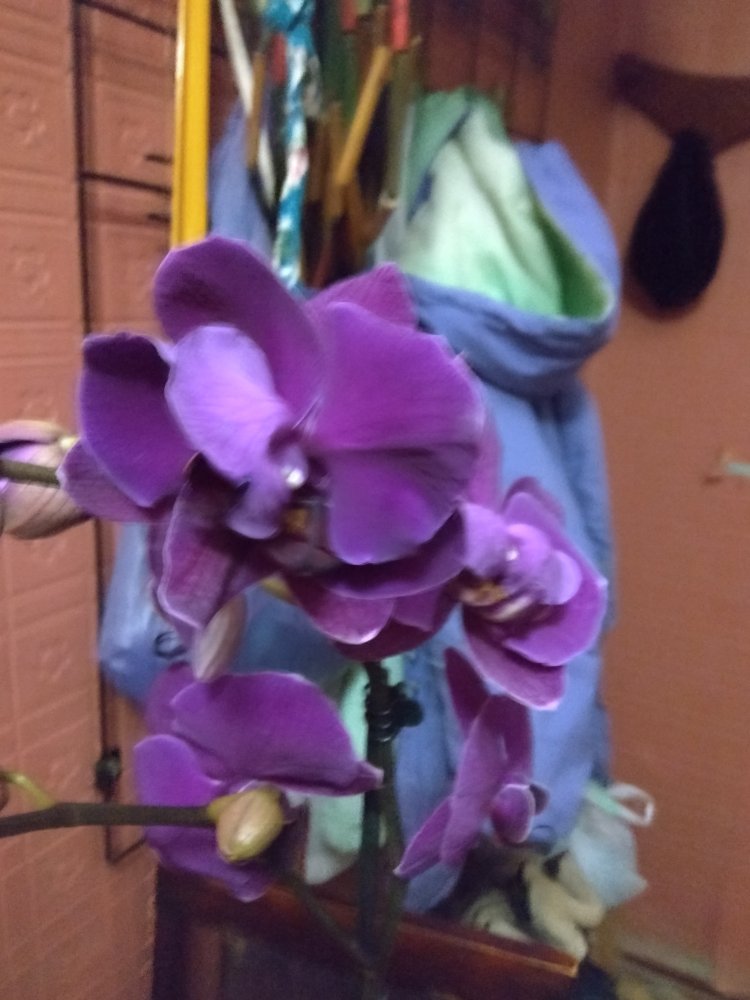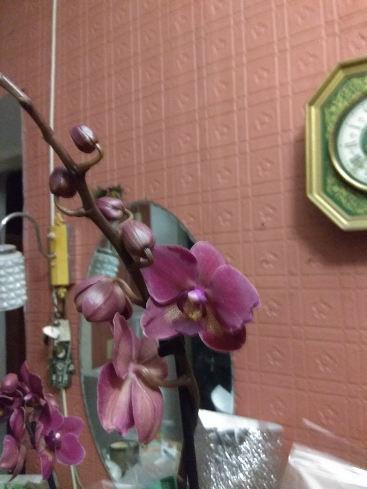 Бархатная Роза,- при покупке цветок напоминал розу, все лепестки были в двойном количестве, за исключением "губы" (фото 1), впоследствии форма цветков стала стандартной. Цветок крупный- 8-9 см, с белой каемкой по краю, цветонос больше 1м длиной, разветвляется, листья длинее 40 см!