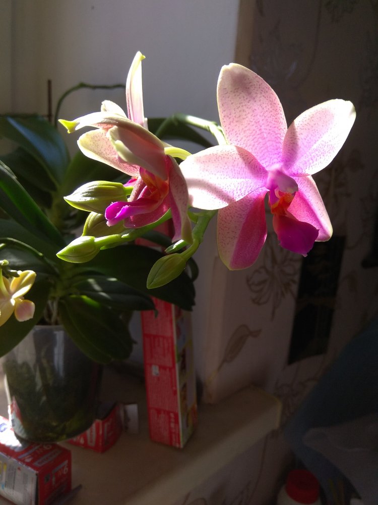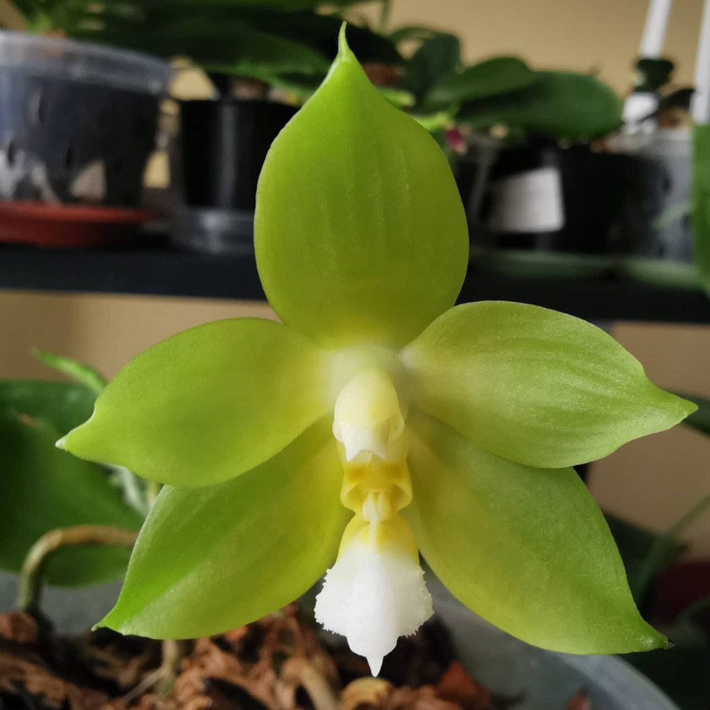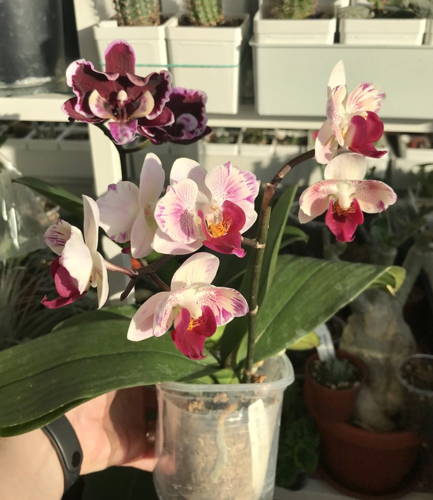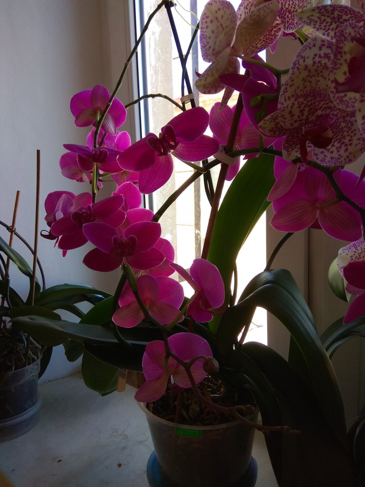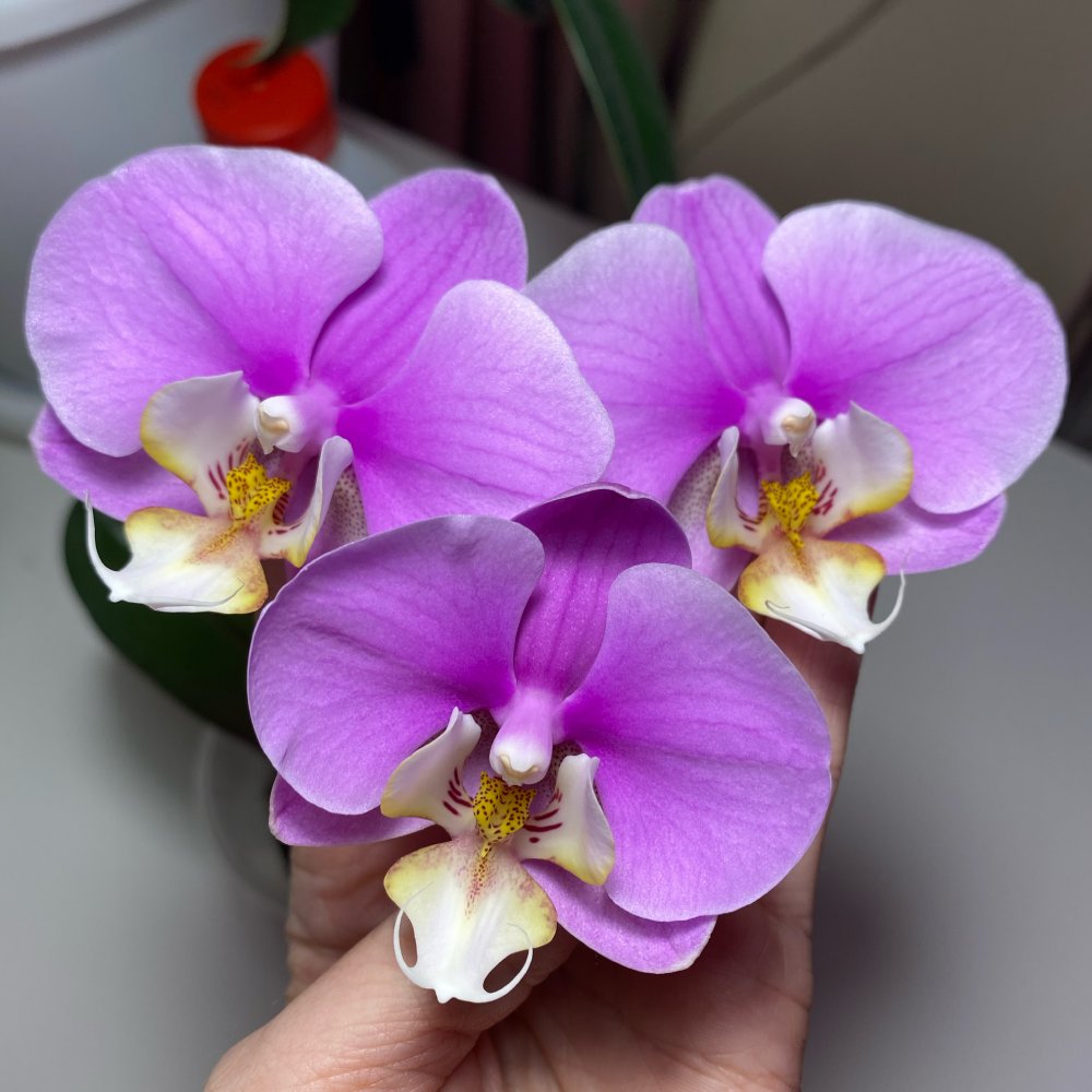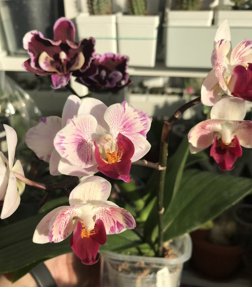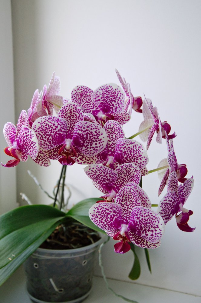 Бархатная Роза,- при покупке цветок напоминал розу, все лепестки были в двойном количестве, за исключением "губы" (фото 1), впоследствии форма цветков стала стандартной. Цветок крупный- 8-9 см, с белой каемкой по краю, цветонос больше 1м длиной, разветвляется, листья длинее 40 см!