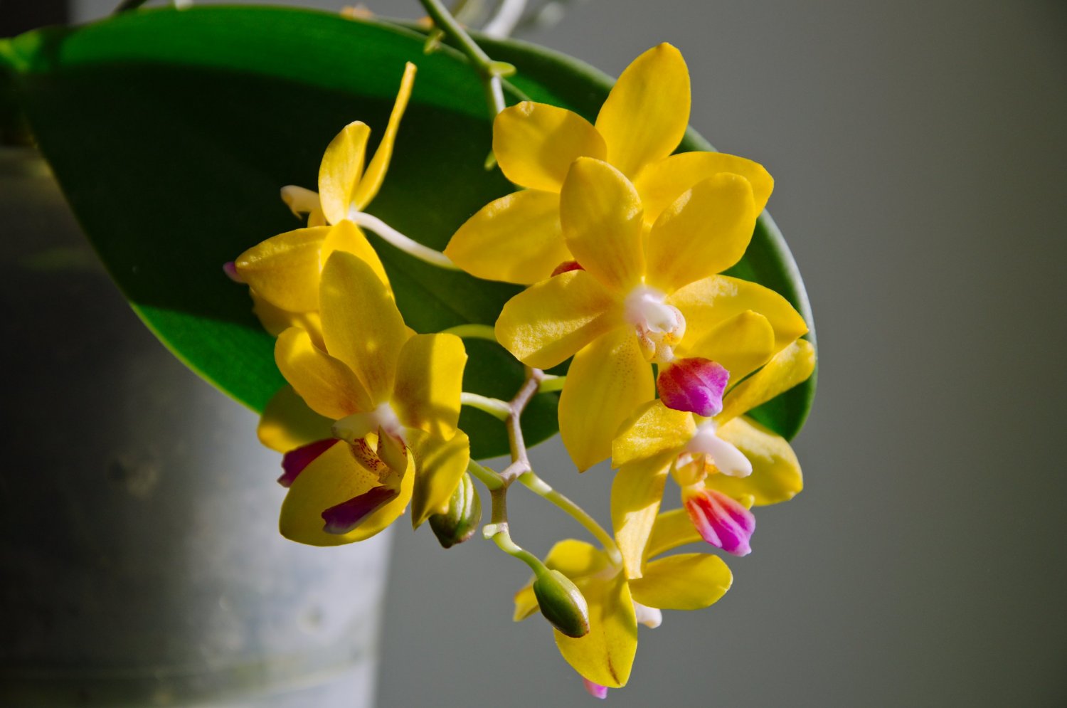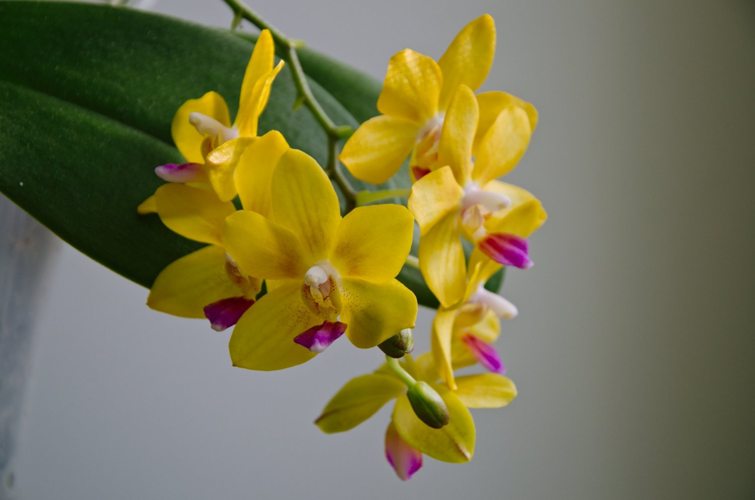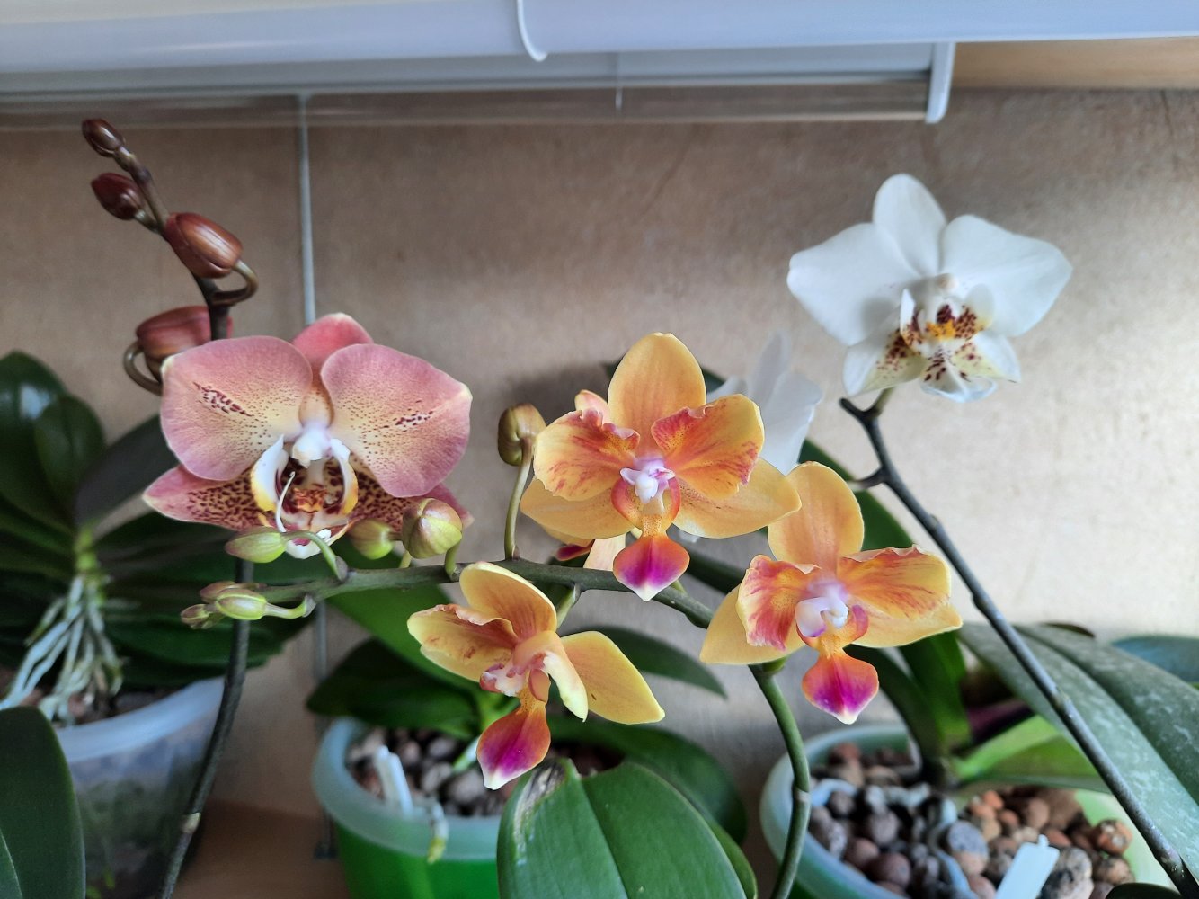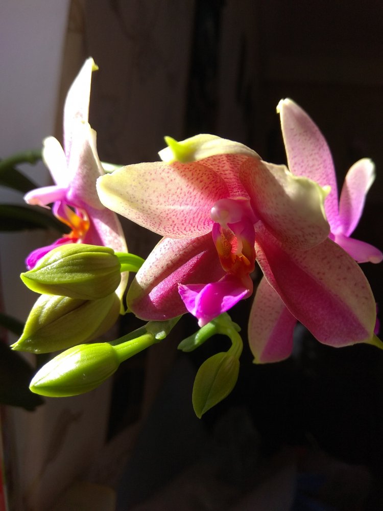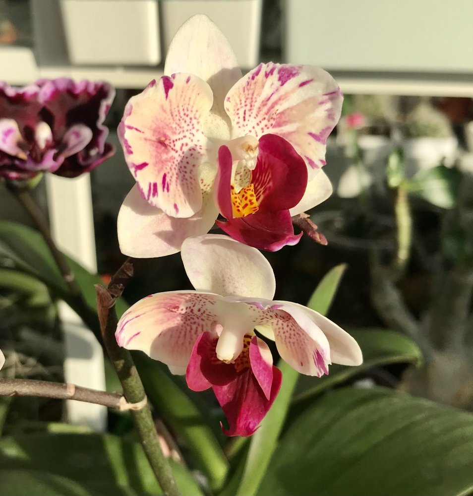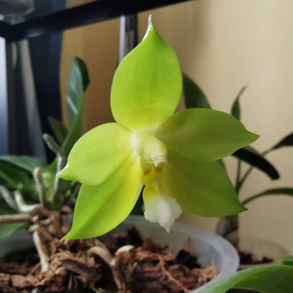 Бархатная Роза,- при покупке цветок напоминал розу, все лепестки были в двойном количестве, за исключением "губы" (фото 1), впоследствии форма цветков стала стандартной. Цветок крупный- 8-9 см, с белой каемкой по краю, цветонос больше 1м длиной, разветвляется, листья длинее 40 см!