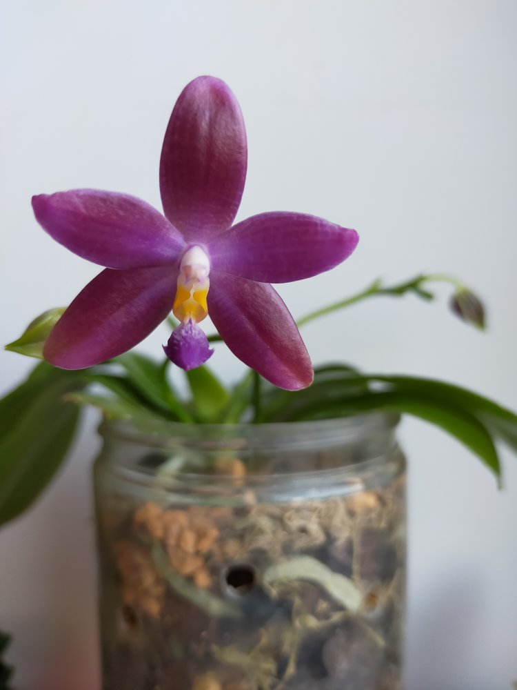 Раскрылся первый цветочек Dtps. Lius Sakura "KF" - перевернутый, неудобно фотографировать.