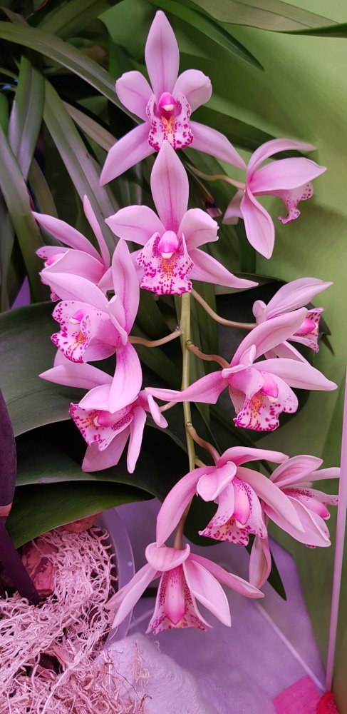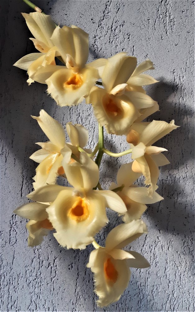 Цимбидиум 15 летний, Cym. Erythrostyllum× Cym Olymilum 'Ivory Elf' цветы бело-розовые с бежевым. Первое цветение у него было двумя каскадными цветоносами 35 цветов.