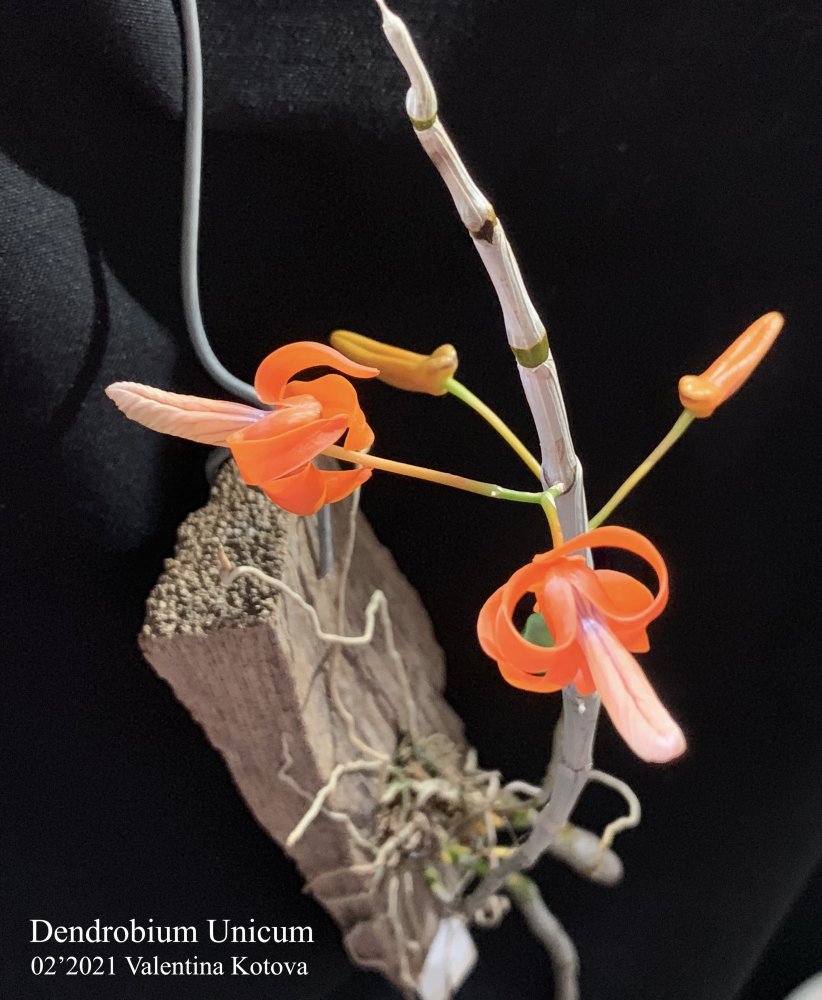 Dendrobium Unicum в своё первое цветение подарил четыре ярко-оранжевых цветочка. Бутоны сначала были зеленого цвета, а затем постепенно наливались оранжевым.