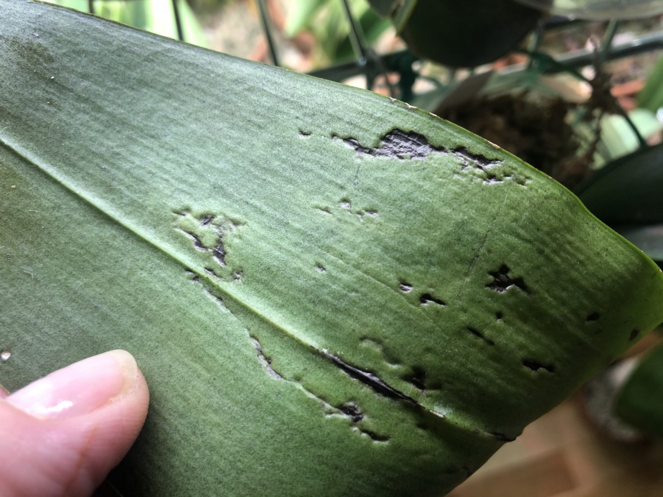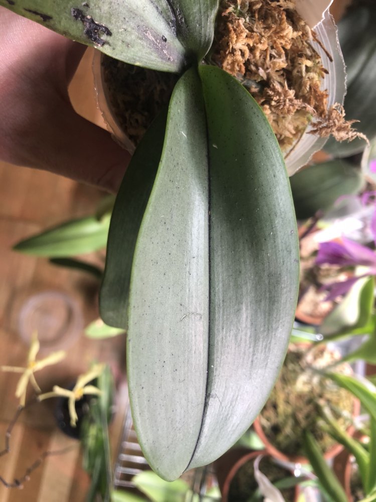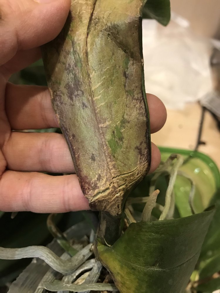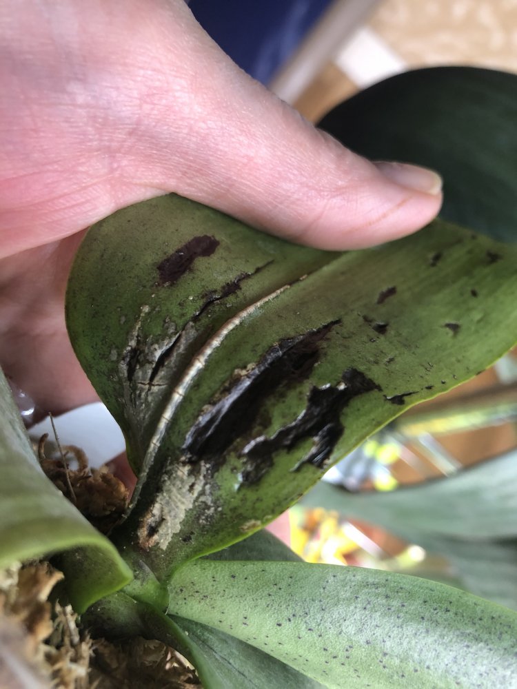 Вот сейчас фото покажу.Видно будет лист весь в чёрных полосках,это высушенная ткань листа,ранее там наросты эти серые были.Не пугайтесь,ничего страшного,это сухое чёрное😀