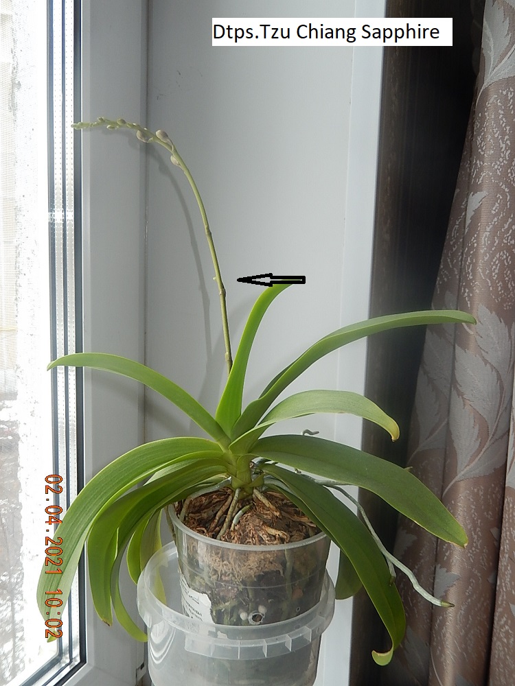 Dtps.Tzu Chiang Sapphire 1200, третье цветение, я думаю после цветения надо бы пересадить т.к. уже из горшка выскакивает. Стрелкой показано ответвление от цветоноса, но сфоткала неудачно.