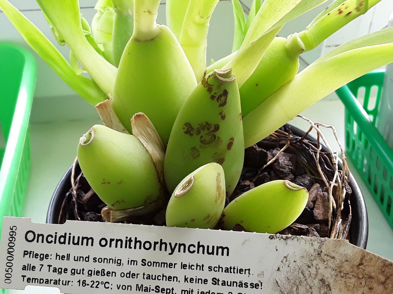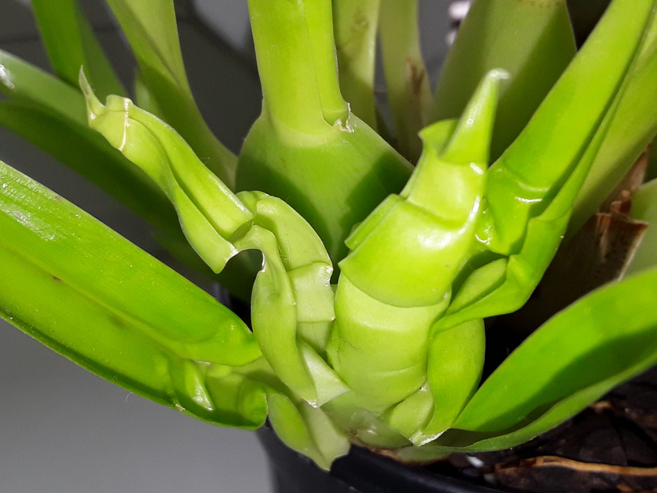 У меня недели три, перелива нет, горшок по весу лёгкий, скорее недолив, поливаю редко, стоит на полке без досветки. После покупки не пересаживала. Верхушка бульб плоская, при нажатии ничего не выделяется. Но, скорее всего Вы правы, скорее всего проблема с корнями. Сегодня вечером посмотрю.