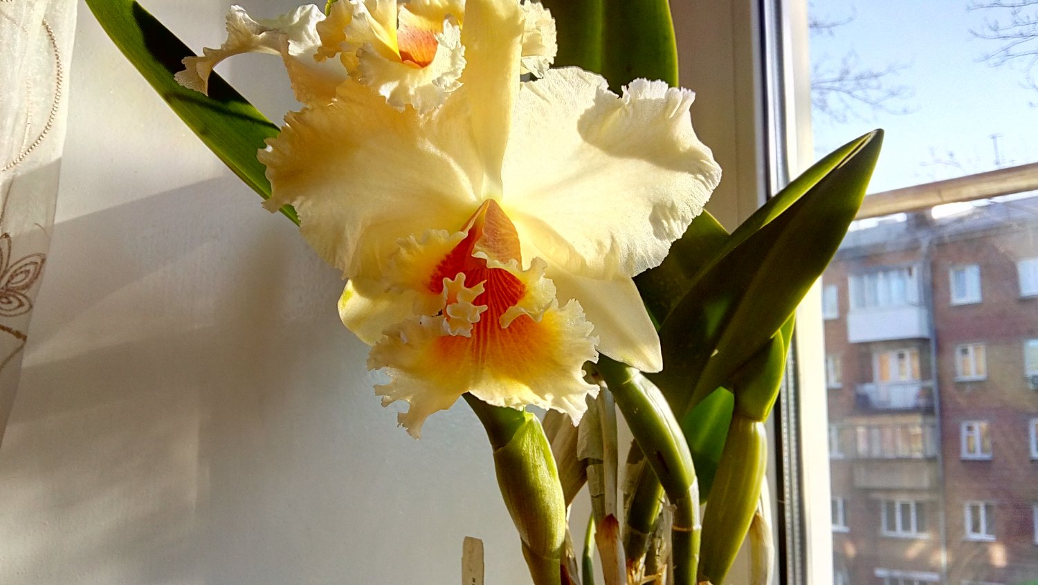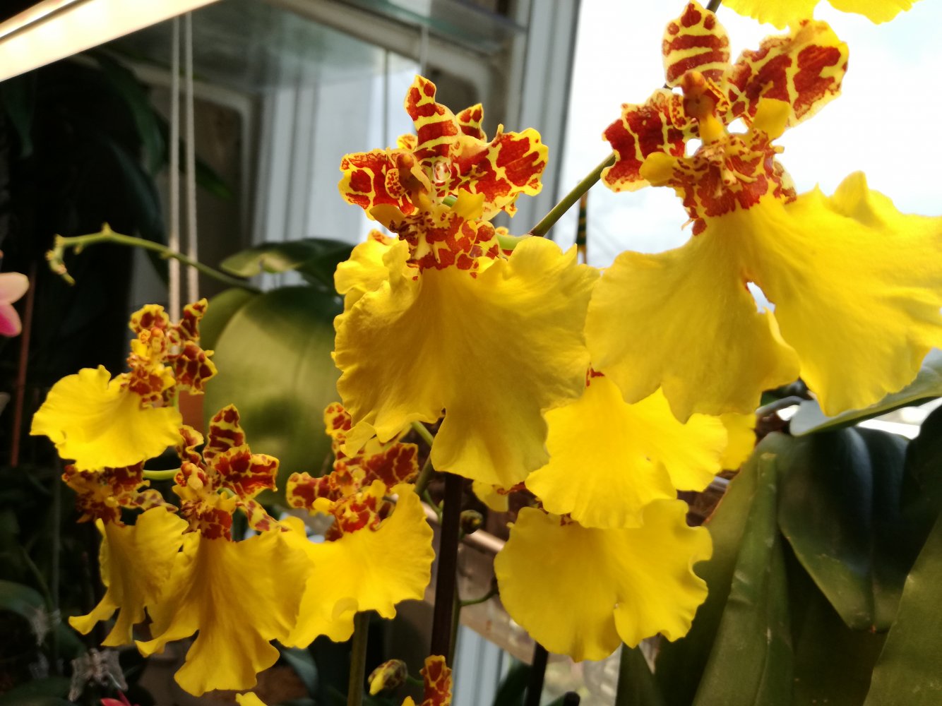 Цветет онцидиум Jiuhbao Gold Tainan. Огромные цветки, неоновая губа