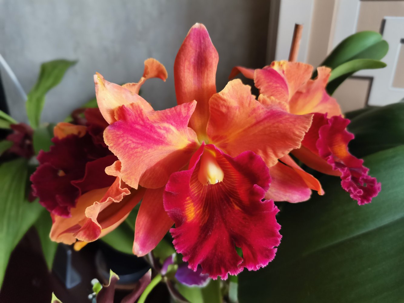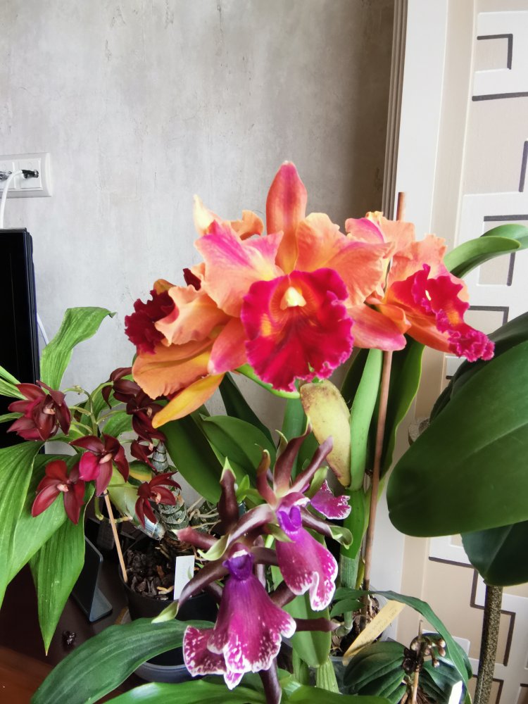 Каттлея rlc Toshie Aoki pokai x blc Sunset Fay Apricot Flare порадовала четырьмя огненными цветами. Это второе цветение, появился легкий цветочный аромат. Фото не передает глубину цвета губы, она более насыщенная.