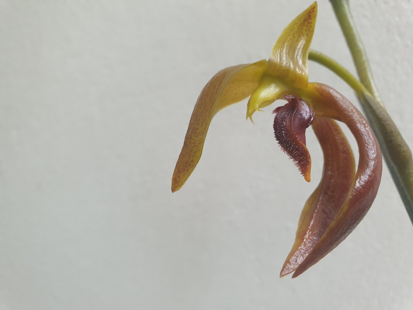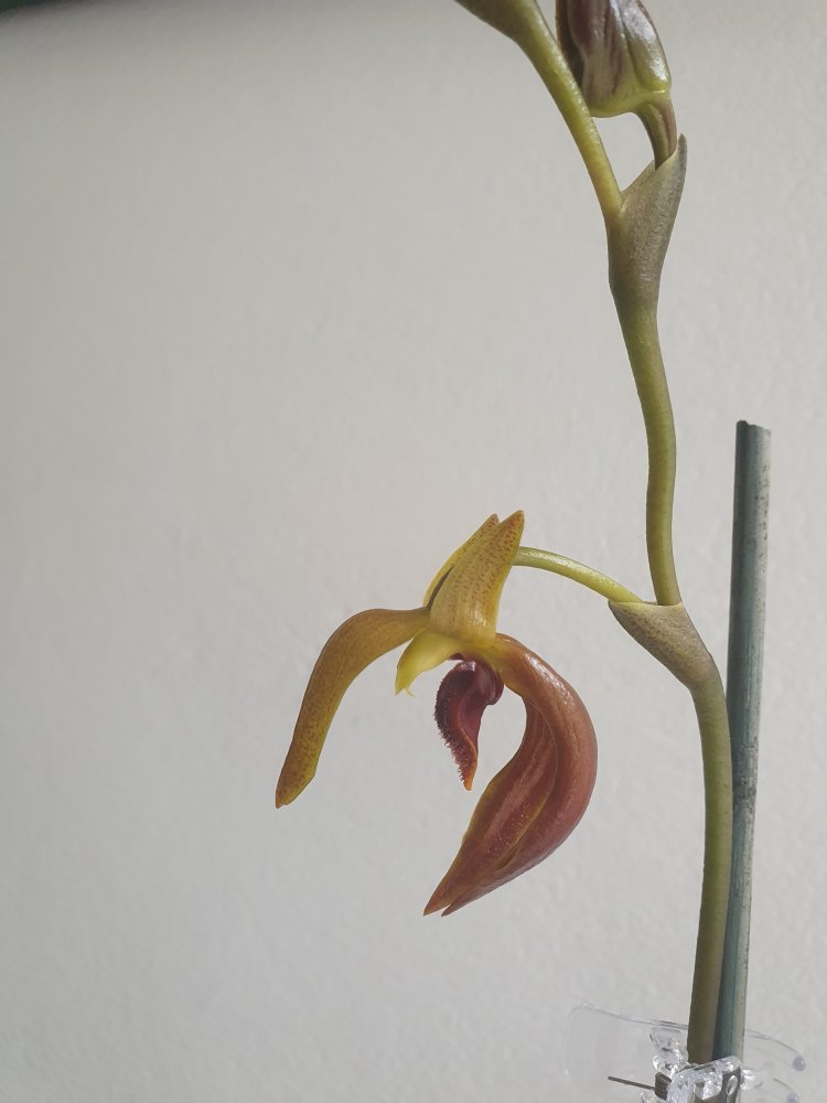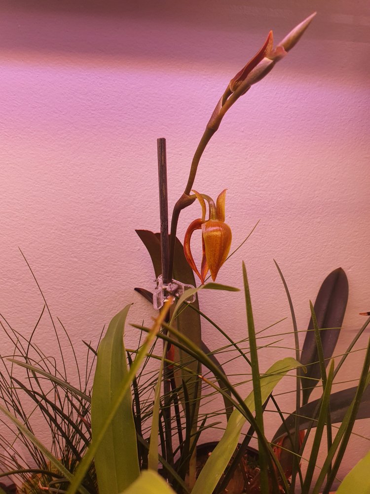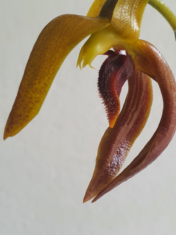 Bulbophyllum mearnsii, без запаха, компактный и с длинными цветоносами, да и цветки не маленькие, в целом хорошее растение. Первое цветение и первый цветок, покупался как Bulbophyllum cootesii но оказался очередным перепутом. Это стало понятно сразу же как только он начал гнать длиннющий цветонос.