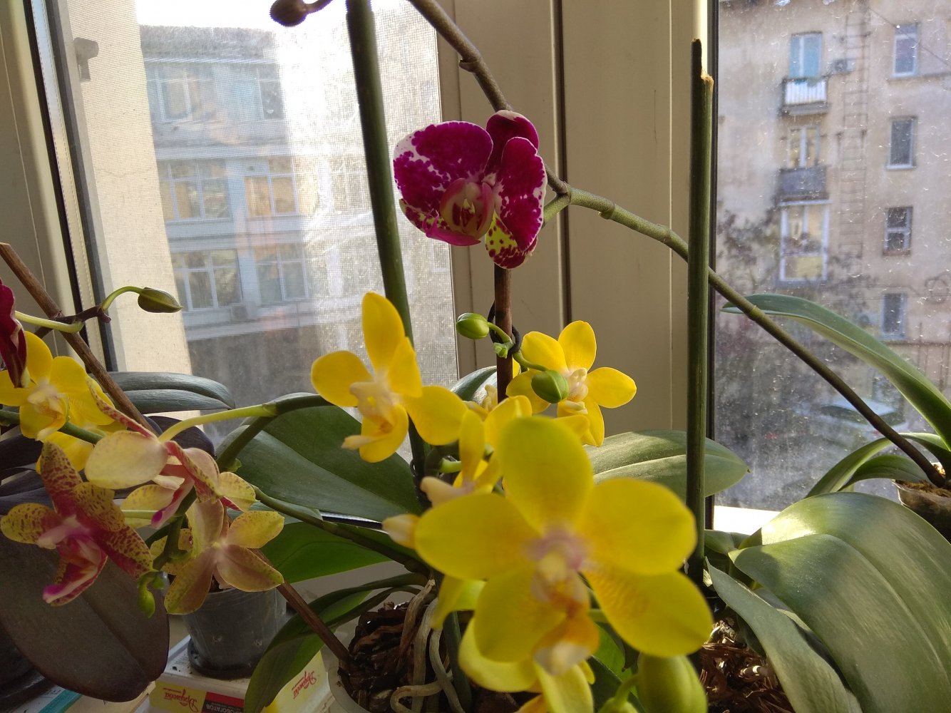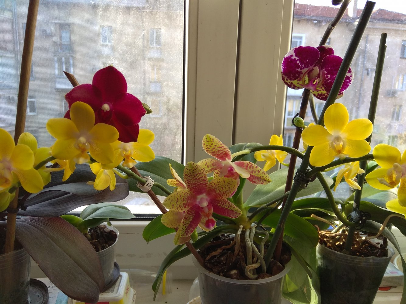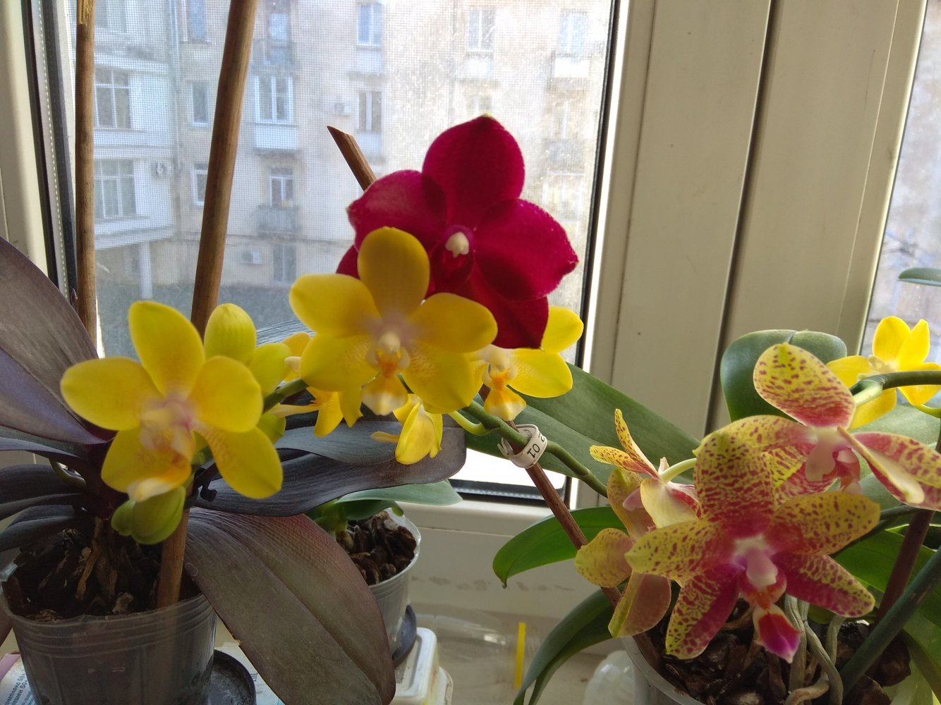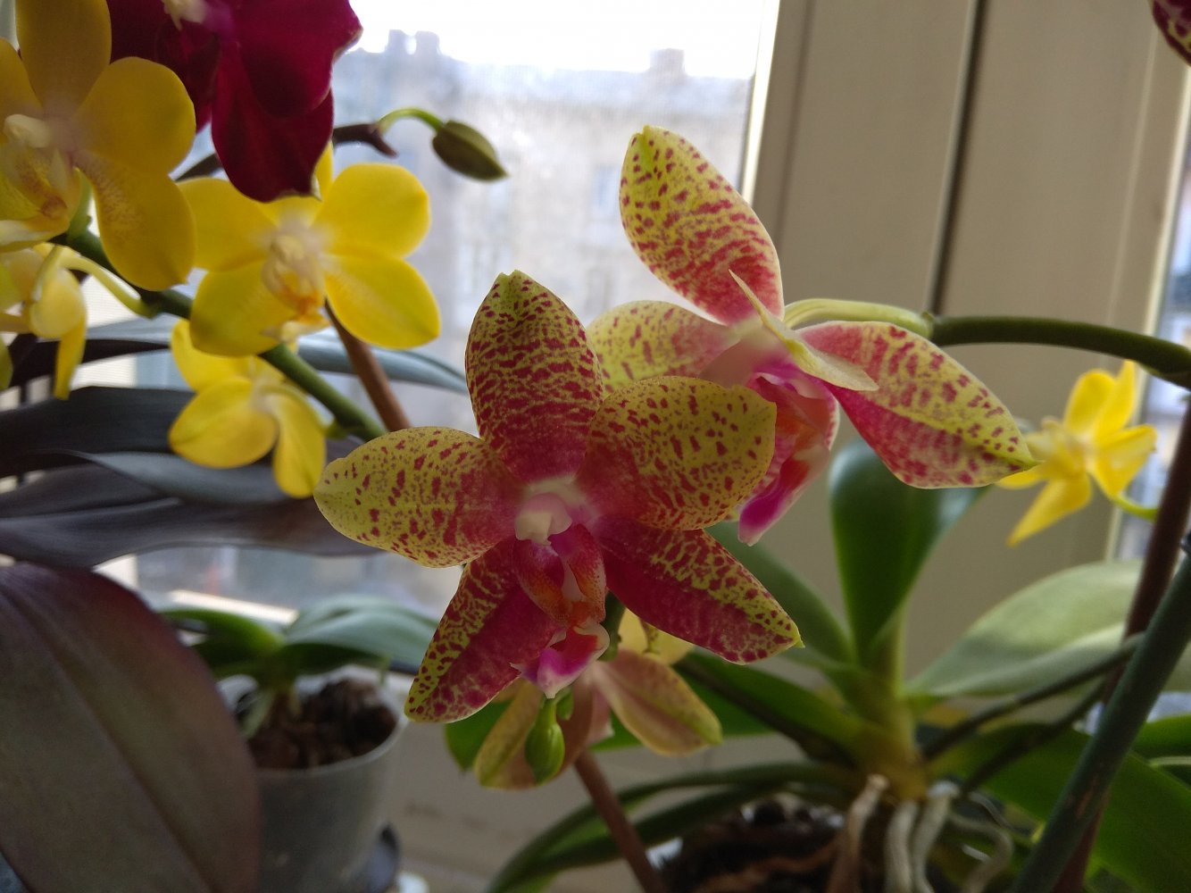ТАК ХОЧЕТСЯ ЯРКИХ КРАСОК!!! Phal. Salu`s Fragrancy (пока раскрылся 1-й цветок), Phal. I-HSIN CUTIE HONEY (3 !!! цветущих цветоноса), Phal. Haur Jih Prince x Samera red, Phal. TWM – 89296. К сожалению, не очень хорошее освещение...
