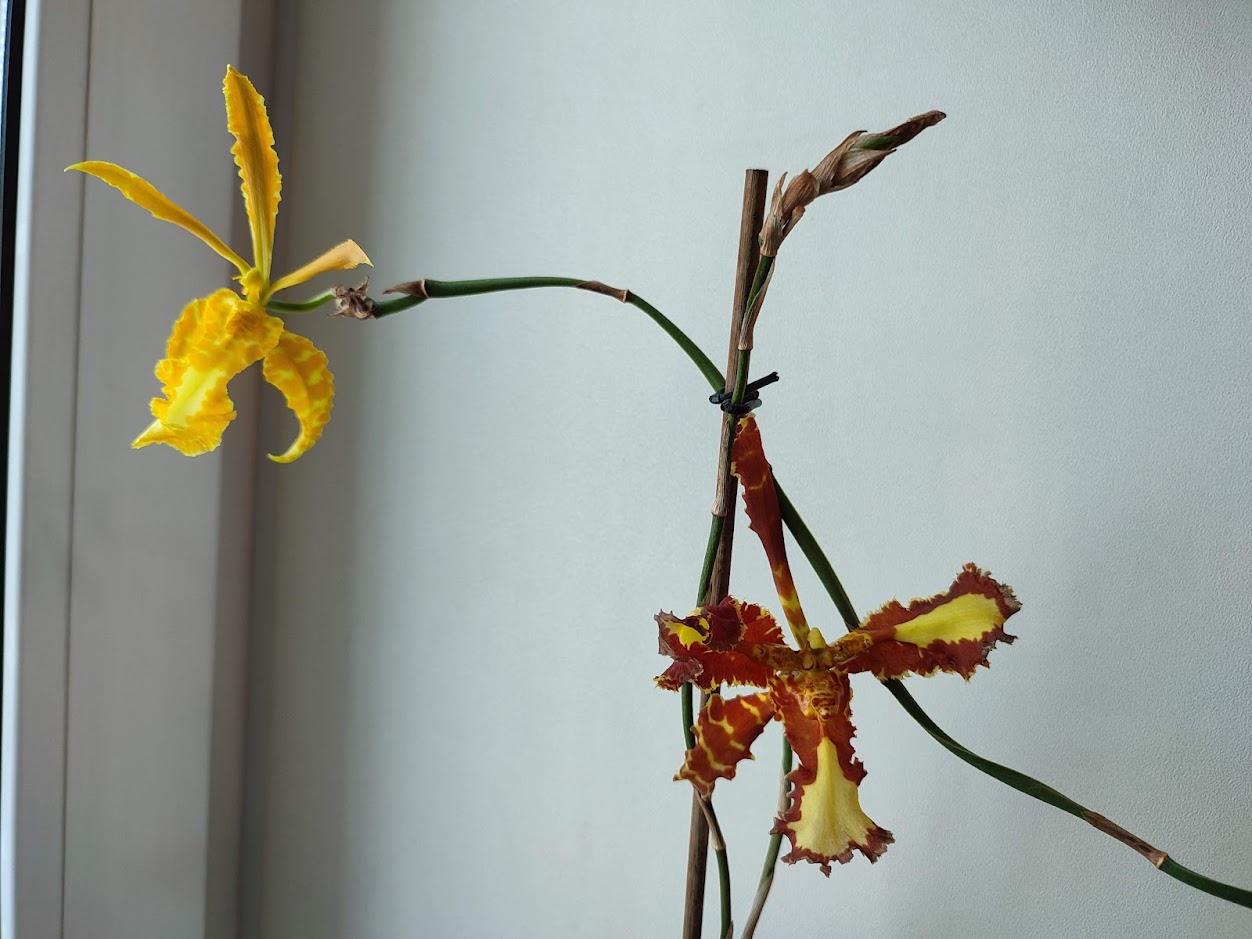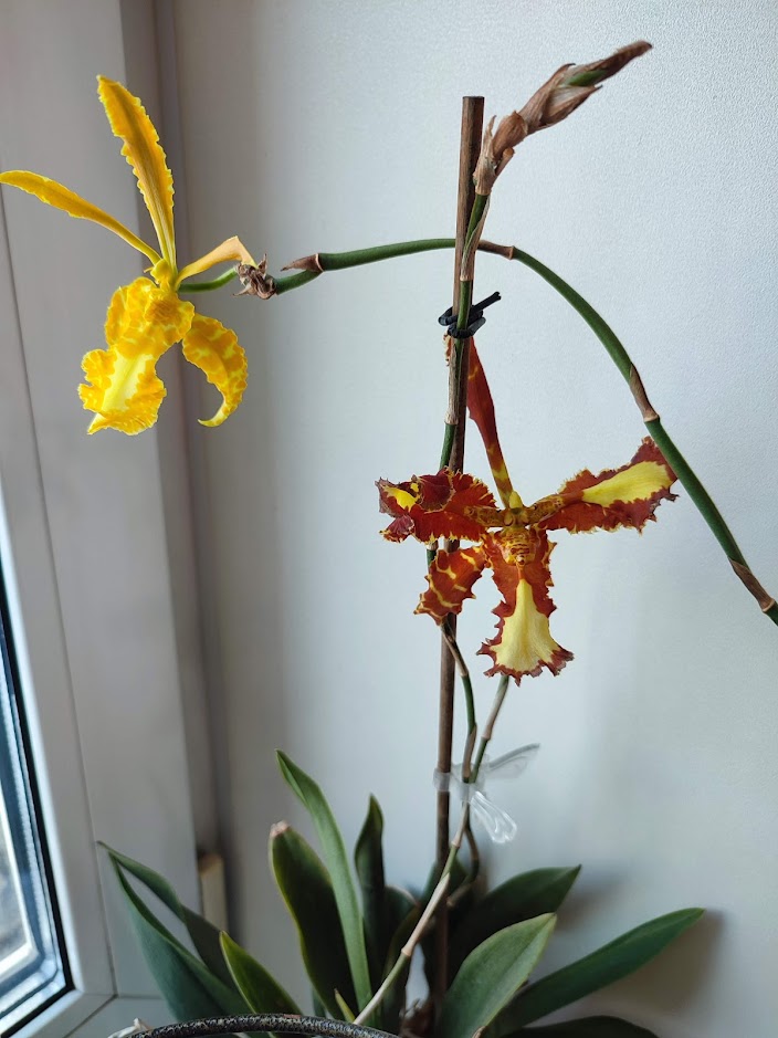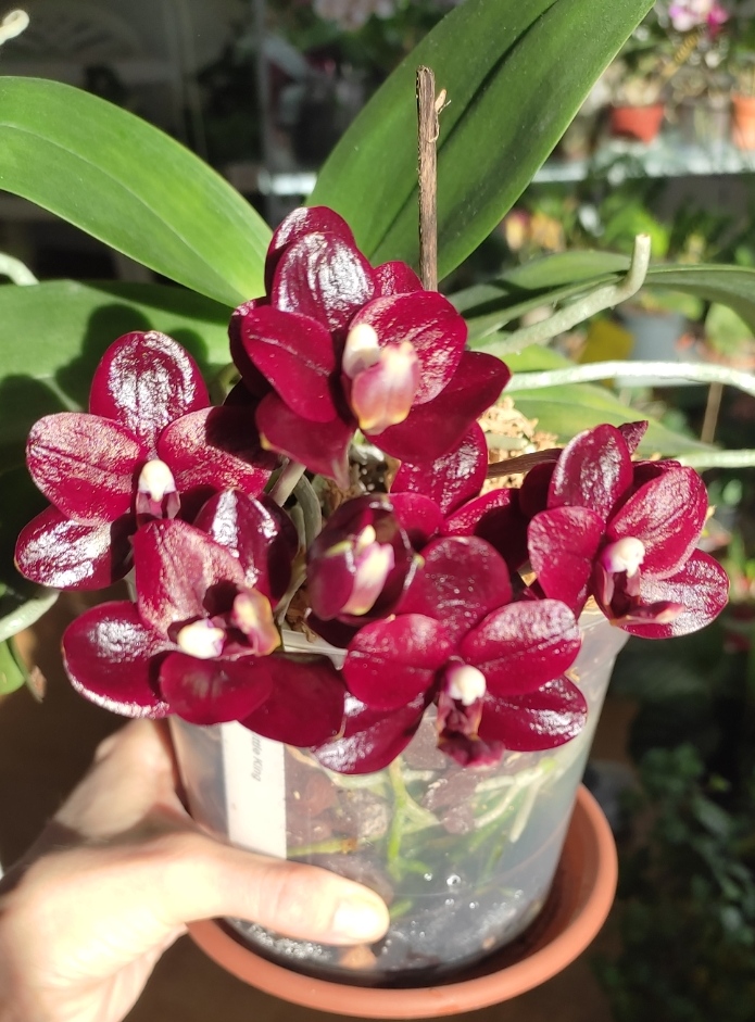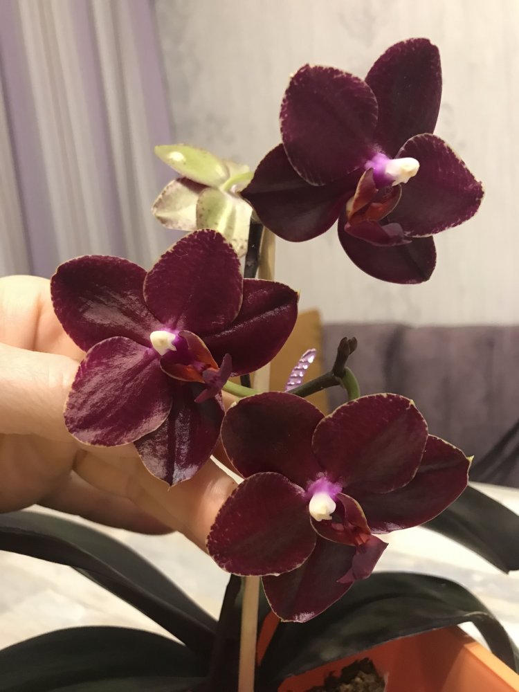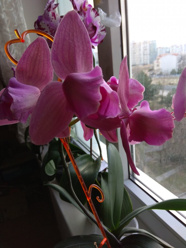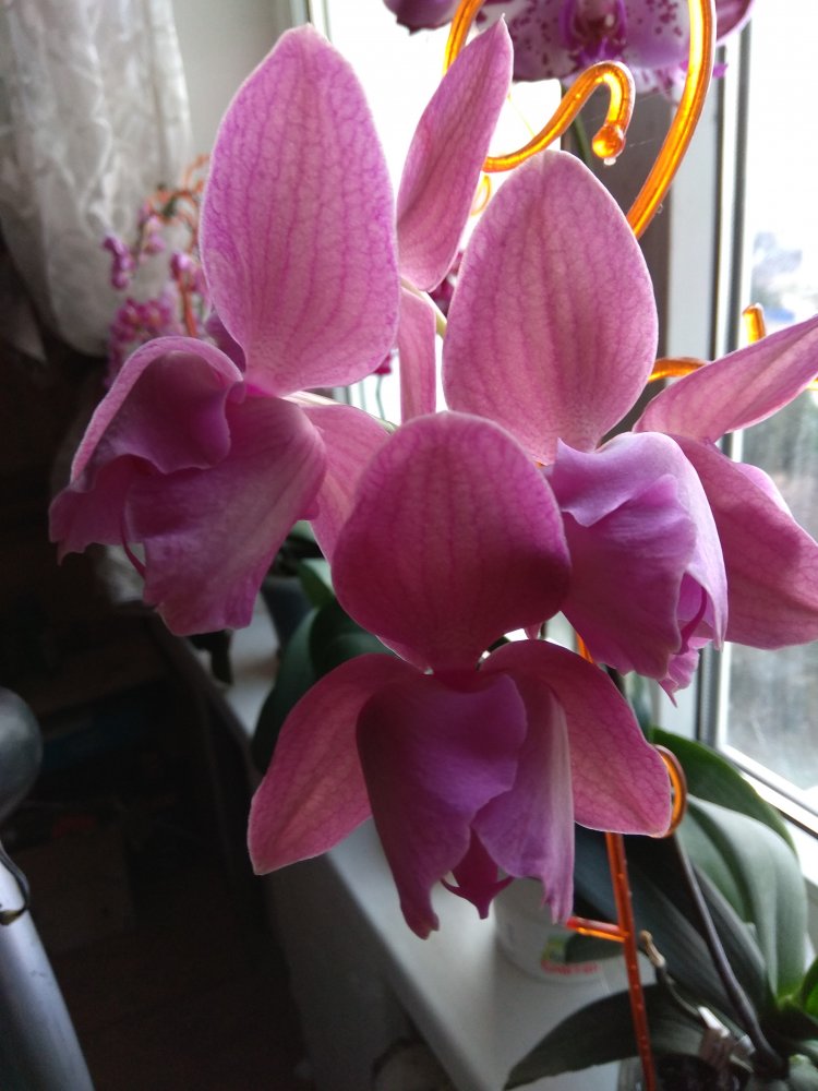ТАК ХОЧЕТСЯ ЯРКИХ КРАСОК!!! Phal. Salu`s Fragrancy (пока раскрылся 1-й цветок), Phal. I-HSIN CUTIE HONEY (3 !!! цветущих цветоноса), Phal. Haur Jih Prince x Samera red, Phal. TWM – 89296. К сожалению, не очень хорошее освещение...