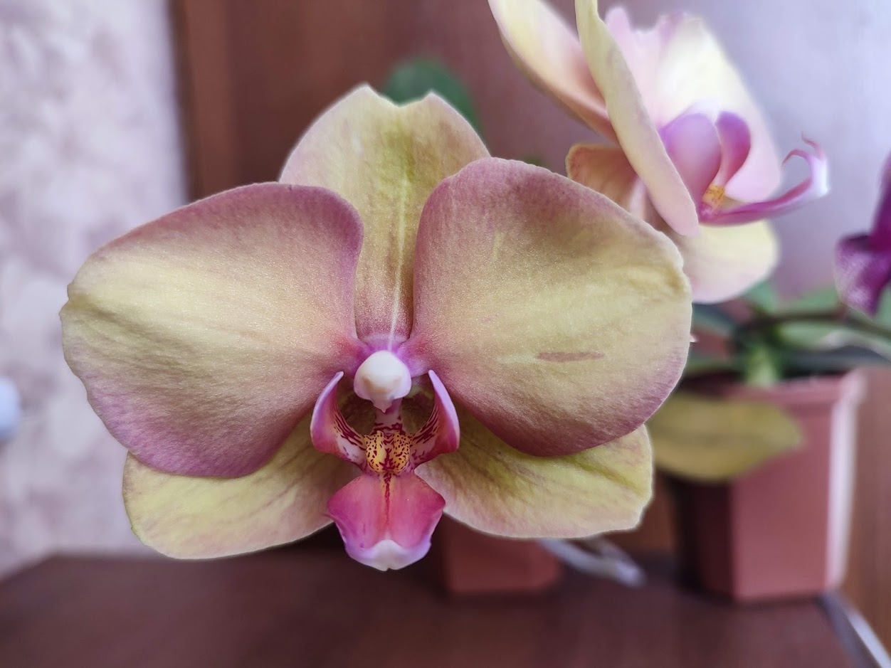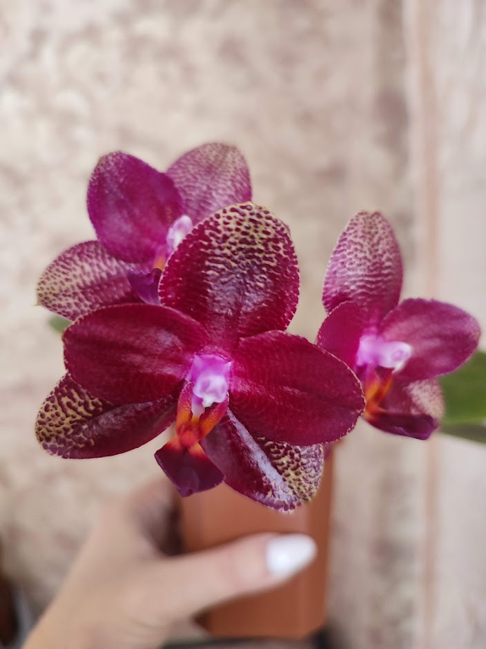 Phal. Legato! ,заказ 30452, доставлен в дек 2019г, первое цветение, 2 цветочка, 8,5 см, аромата нет, сахаристый отблеск на лепестках, но почему то какие то рваненькие. Ну и не повезло, не пелорик)