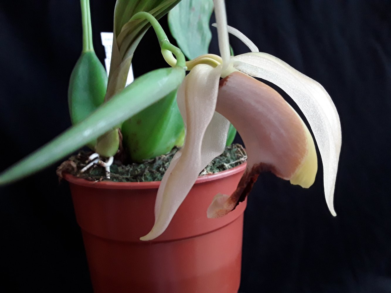 Coelogyne xyrekes, Schwerter. Получала в 2018 году сеянец в горшочке 3 см. За годы, что здесь заказываю, пробовала выращивать больше десятка подобных мелких целогин от Швертера, все раньше или позже погибали, не вырастали. Эта тоже первые 2 года периодически пыталась погибнуть, но как то удавалось ее вытянуть. К сожалению, очень редкие видовые целогины купить сразу взрослыми практически не реально, иногда единственный шанс на их приобретение - покупка сеянцев у Швертера. Xyrekes тоже всегда хотела заиметь в коллекцию, потому что нравилось, какие цветы наследуют гибриды с ее участием - крупные, розоватые. Что в этот сезон зацвет, стало для меня приятным сюрпризом, поскольку растение еще не крупное. Из за этого же цветы кажутся несоразмерно большими по сравнению с самим растением. Вобщем, для любителей целогин, если сможете достать - отличное растение. Считается сложной в содержании, но в принципе взрослое здоровое адаптированное растение будет расти без особых проблем. У меня растет с каттлеями на южном подоконнике. Летом с притенкой в жару и очень обильным поливом на весь весенне-летний сезон (верхний слой мха практически никогда не просыхает). Зимой растет там же, но солнца уже нет и полив значительно более редкий с просушками.