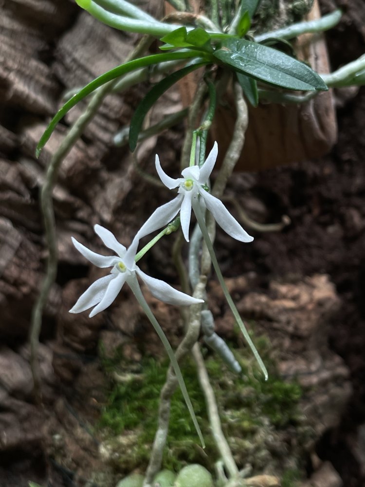В июле месяце от Швертер ко мне приехал малышок Mystacidium venosum.И практически сразу стал растить свой самый первый цветонос.Расчитывала на один цветок,впоследствии выяснилось,что растёт три бутошки.В итоге получилось два цветка,третий почему-то не захотел раскрыть.