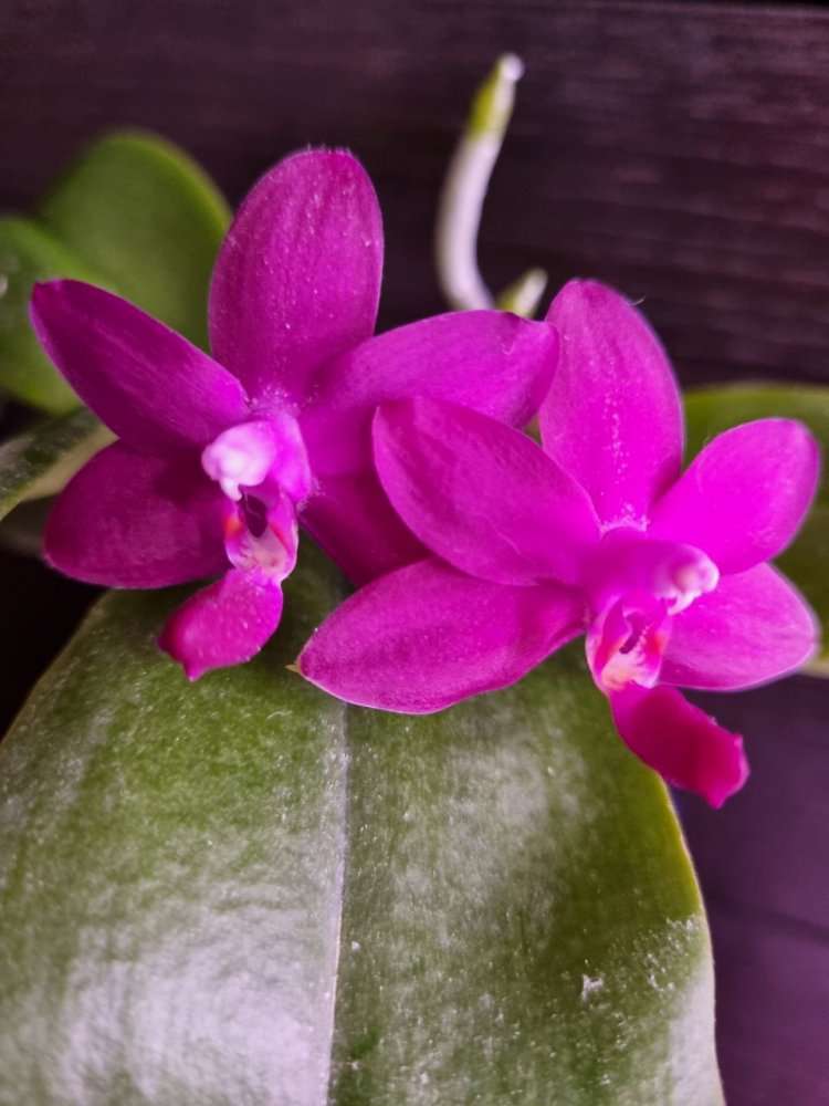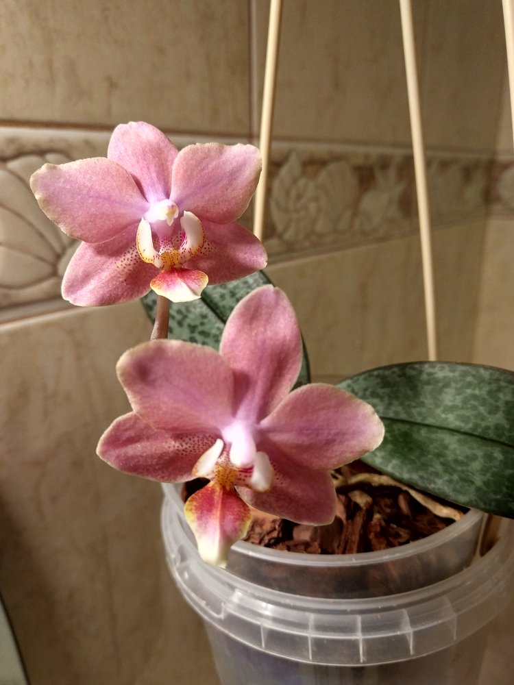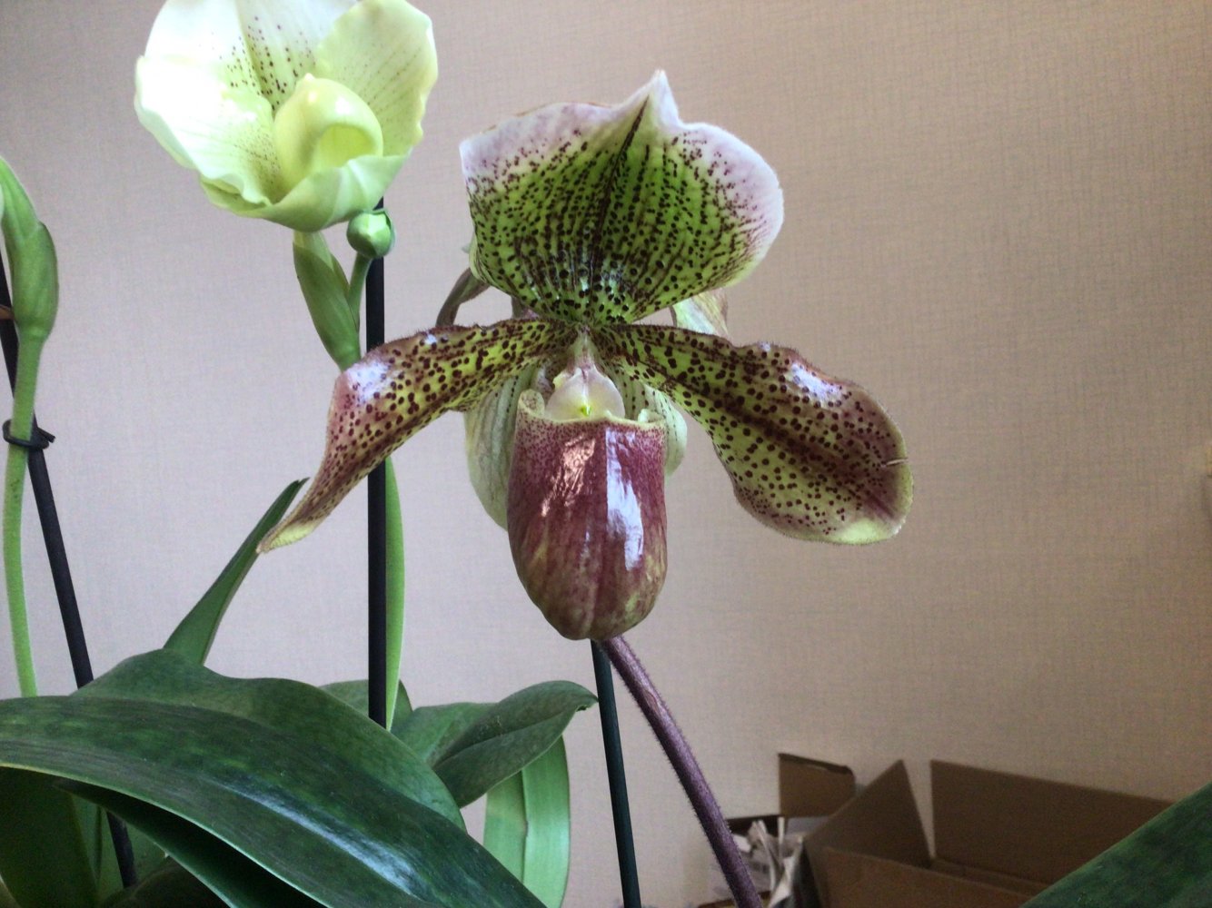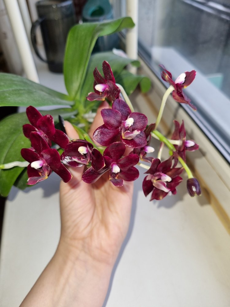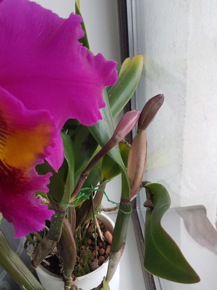 Aliceara Peggy Ruth Carpenter также распустилась на три месяца раньше, чем в прошлые разы. После деления и пересадки я поставил её на солнечное место, наверное поэтому цветоносы появились уже в мае. От перестановки количество цветков значительно не увеличилось, но два вместо одного – это тоже прогресс.
