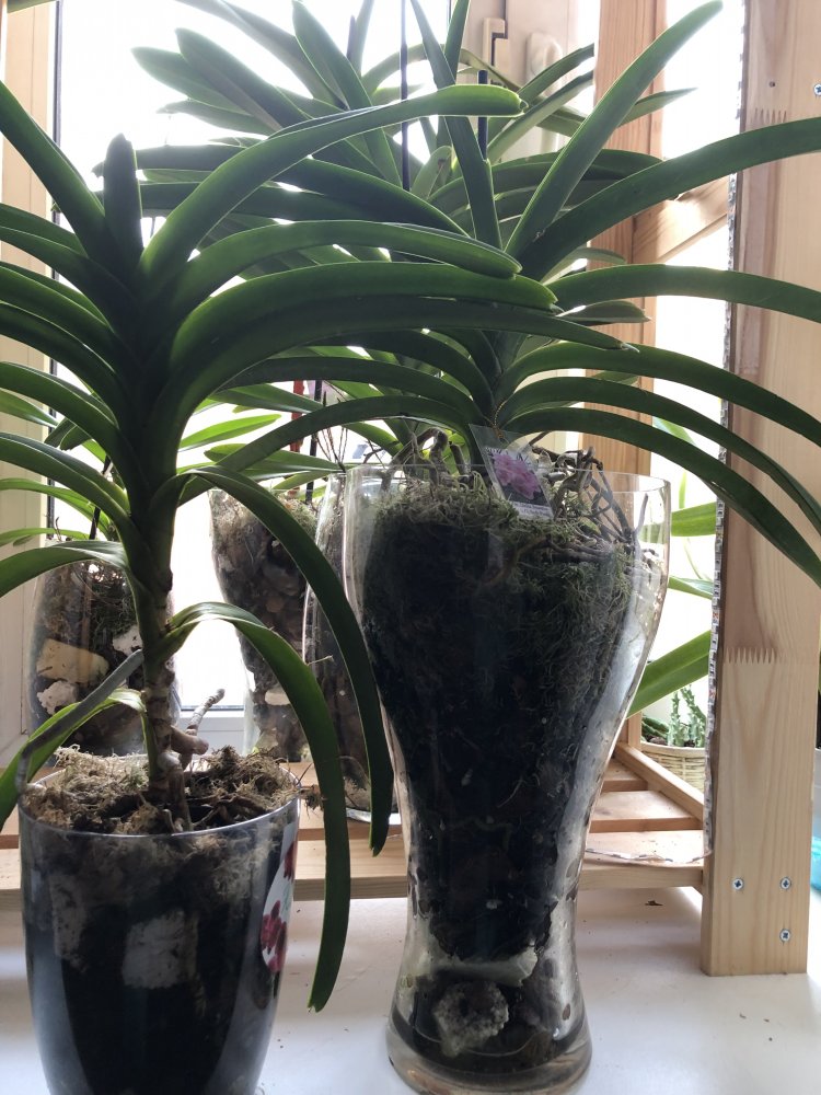 Всем здравствуйте. Обещала Владимиру поделиться моим опытом в выращивании своих Ванд. Прошло 2 года, пока я нашла с ними общий язык. Первую Ванду мне подарили цветущую и я влюбилась. Сейчас у меня их около 30 и еще 40 в заказах. Сейчас все мои Ванды живут в закрытой системе: если корневая не большая- тогда в пластиковом кашпо, если большая- тогда в стеклянной вазе( покупаю в Леруа около 200 руб.) Грунт составляю из того, что есть в наличии: крупный керамзит, пенопласт, чуть угля, мох, крупная кора- главное, чтобы корни дышали.